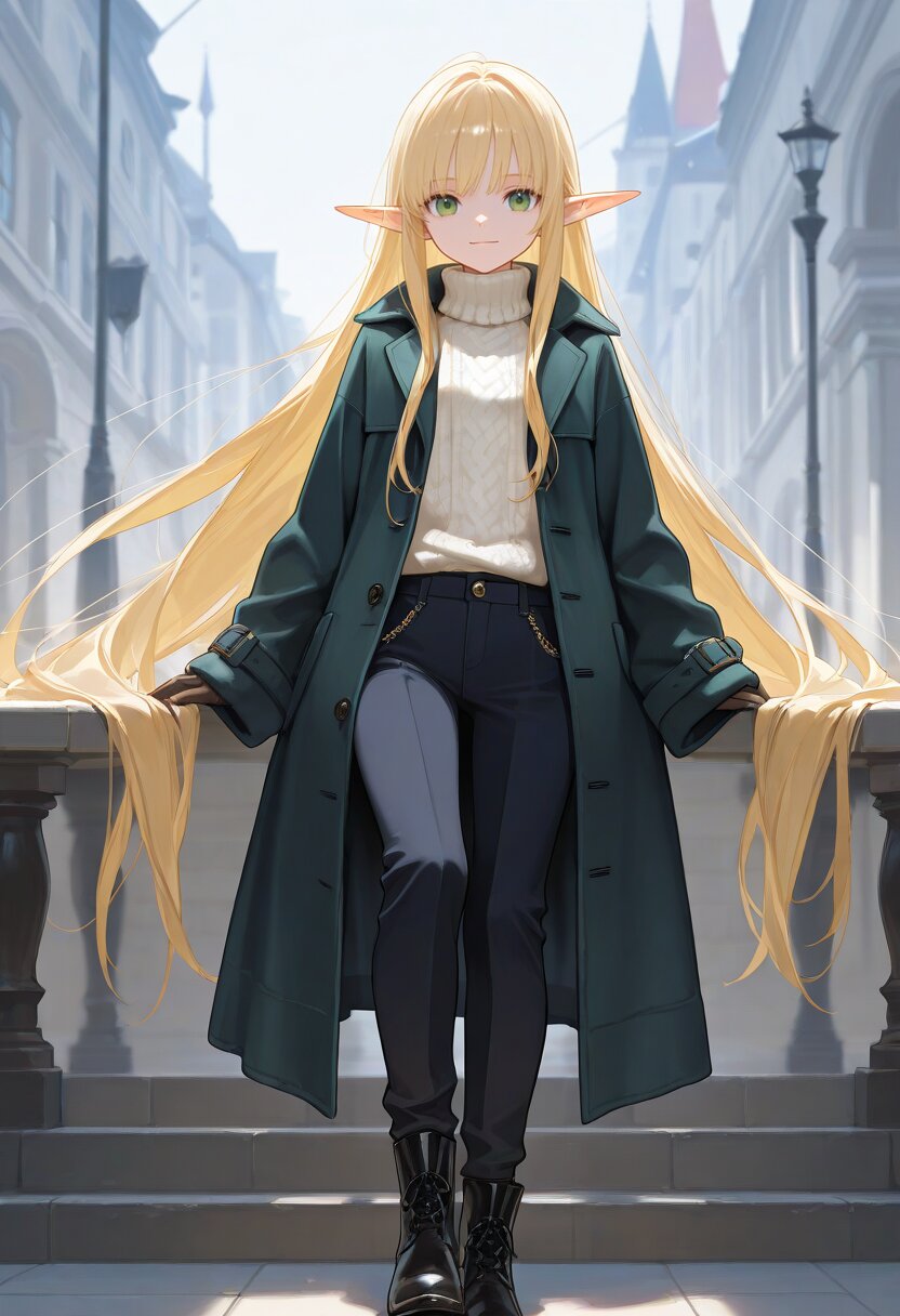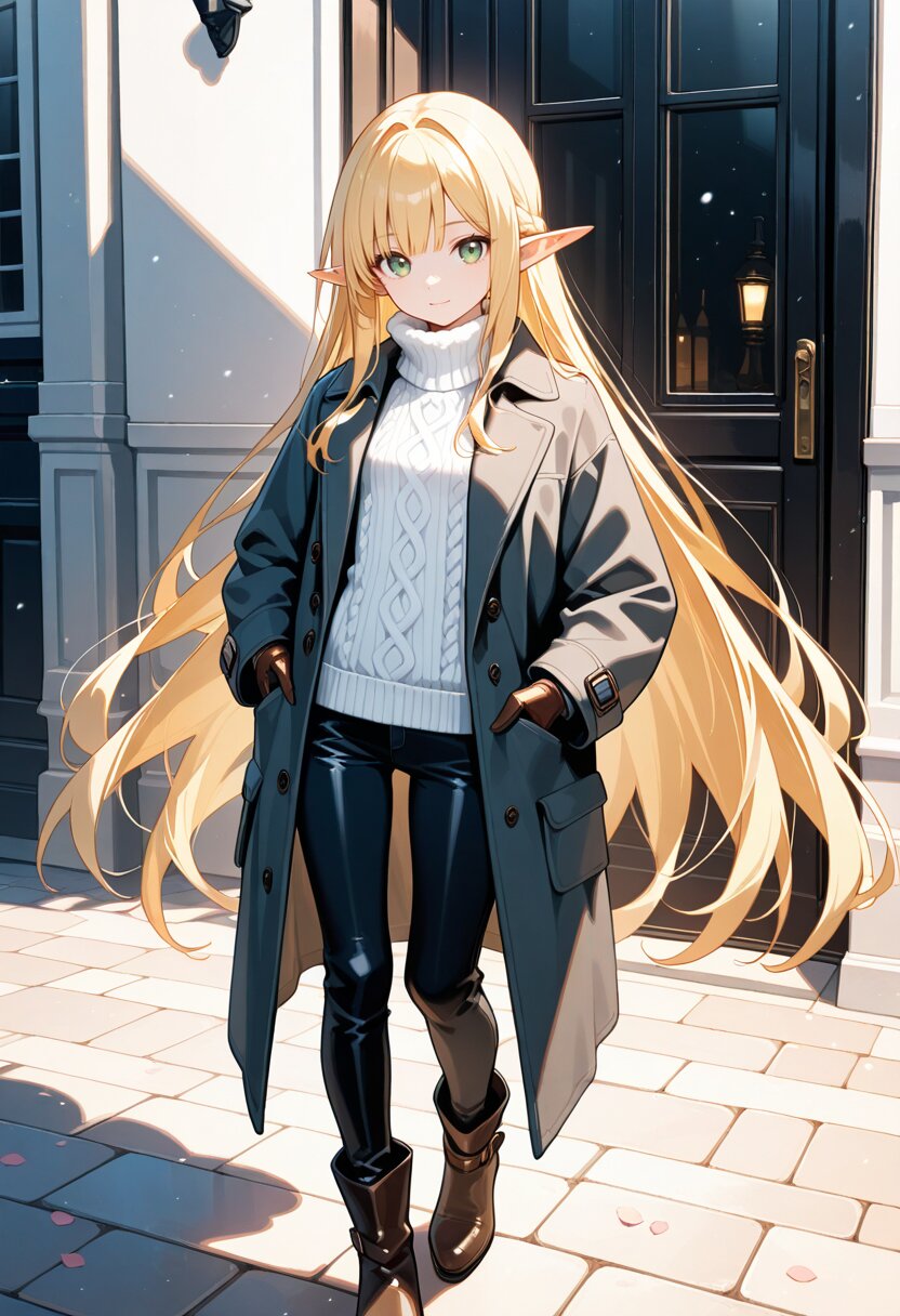 masterpiece,best quality,highres,highly detailed,detailed eyes,general,1girl,solo,17 years old,(Elf ears,pointy ears,(blond hair, very long hair,bangs, green eyes,hands on pockets)),cute girl,slender,small breasts,Very long sleeves that cover wrists,light smile,closed mouth,slender girl,winter town,fantasy BREAK (Luxurious turtleneck knit:1.2),(Wool coat:1.4),Wool blend tapered pants,Ankle boots,Leather gloves,The color palette of the outfit is Black,White,Navy,and light brown,
