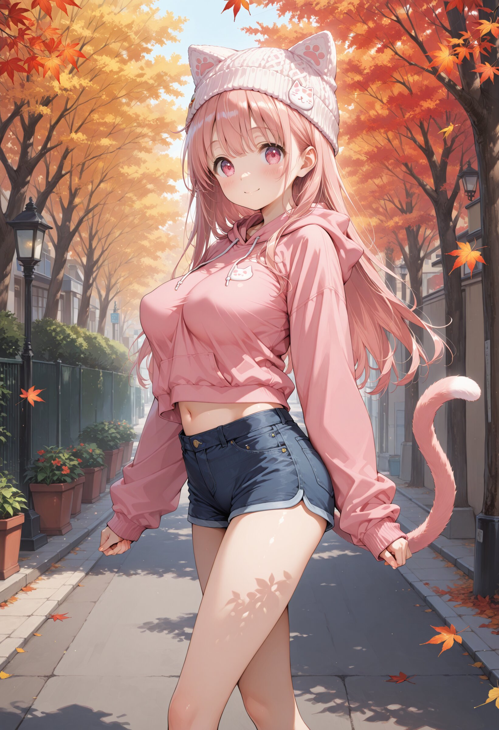 masterpiece, best quality, highres, ultra-detailed, extremely detailed, detailed, 1girl, loli, light pink hair, long hair, pink eyes, cat tail, cat ear style knitted hat, pink hoodie, midriff peek, short pants, impossible clothes, big breasts, perky breasts, long sleeves, navel, moe sode, Sleeves past wrists, slim legs, autumn, park square, sitting, wariza, look at viewer, innocent expression, happy, from above, a field of fallen leaves,