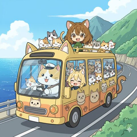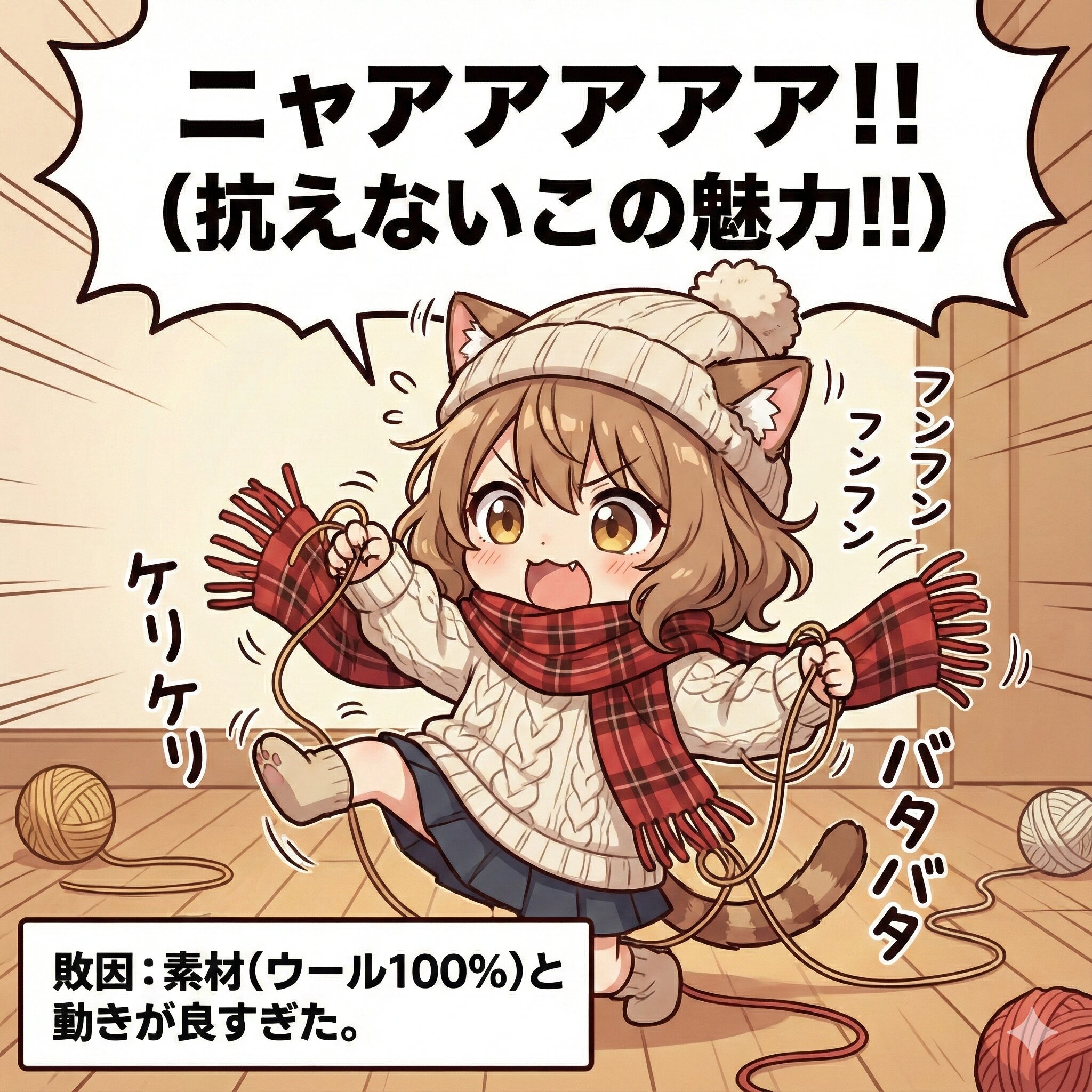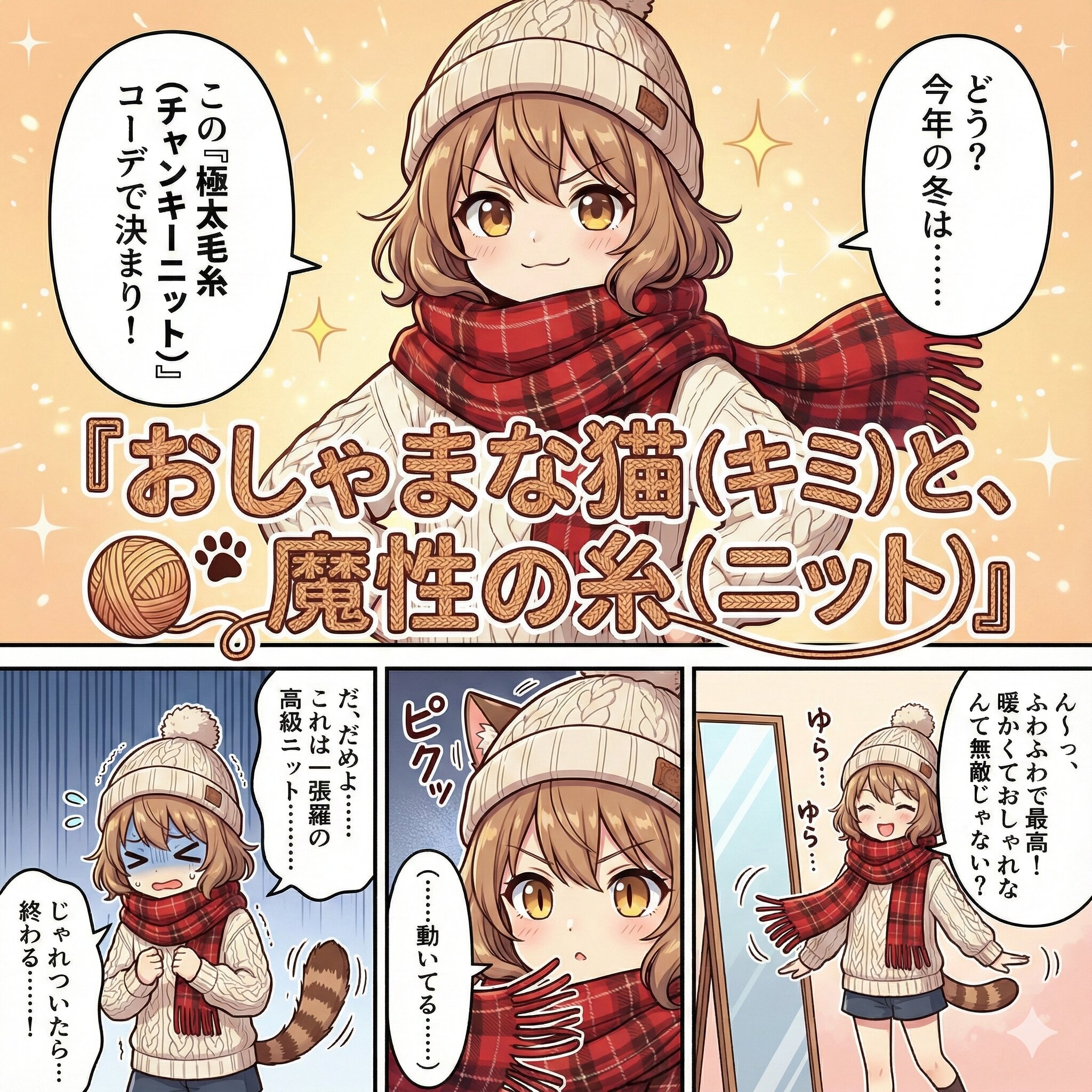 ニットと猫をネタに、この子が主役のユニークな短編漫画を作って。 最初のコマは大コマで、下部に「ストーリーから読み解いた」タイトルを入れる。(そのタイトルはストーリーから読み解いたテーマを反映したモチーフをあしらった飾り文字とする) セリフはすべて日本語。右上から左下へ読むことを前提としたセリフ・コマ配置。おしゃれなニットの服や帽子、マフラーを着せて。