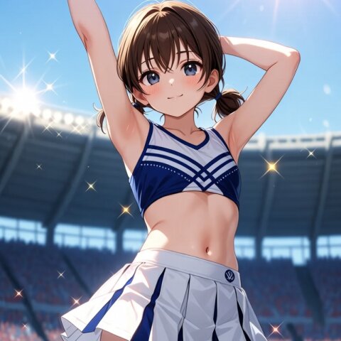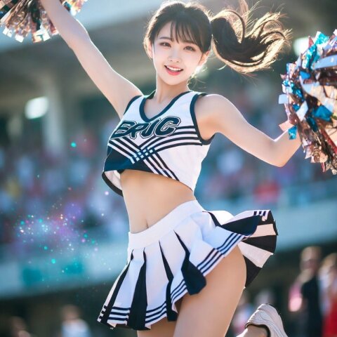 A graceful Japanese cheerleader in her 20s with a slender frame and luminous almond-shaped eyes, dressed in a shimmering coral and gold uniform, captured in a dynamic high-angle shot mid-twirl against a vibrant evening sky