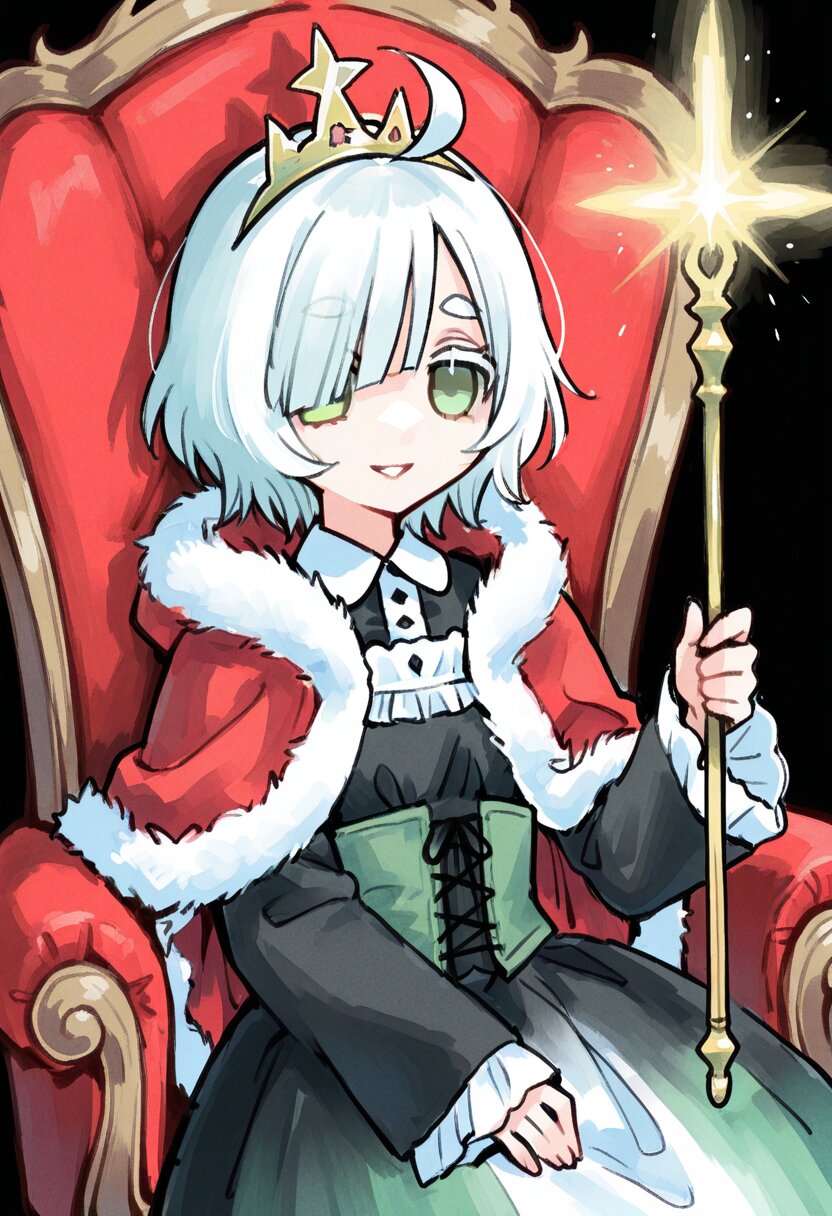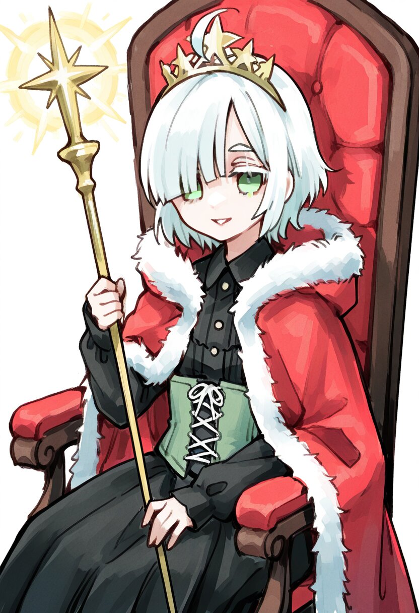 <lora:inmnstyleilxl:0.9>, best quality, masterpiece, very aesthetic, watercolor painting, general, 1girl, chibi, solo, upper body, gold crown, fur trimmed cape, red cape, black dress, black lace-up corset, flare skirt, white frills, holding gold sceptre, sitting decorated chair, sleeves past wrists, (bright white hair), short hair, blunt bangs, white thick eyebrow, white colored eyelashes, (hair over one eye), ahoge, mint green eyes, smile, parted lips, looking at viewer