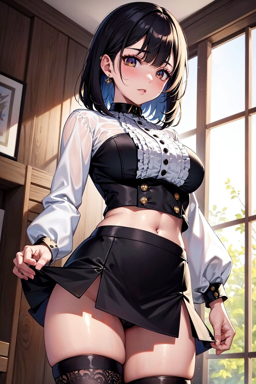 masterpiece, hyper detailed, 8K, hyper detailed illustration,extremely detailed CG, Japanese woman, 23yo,bishojo,idol face, (cute:1.1), (pretty:1.1), hyper detailed face, hyper detailed eye, beautiful eye, eyeshadow, natural makeup, extremely detailed, medium hair,(bangs:1.1), thin, tall, perfect anatomy, perfect proportions, extremely detailed body, blouse, crop top,short skirt, thighhighs, hyper detailed background,
