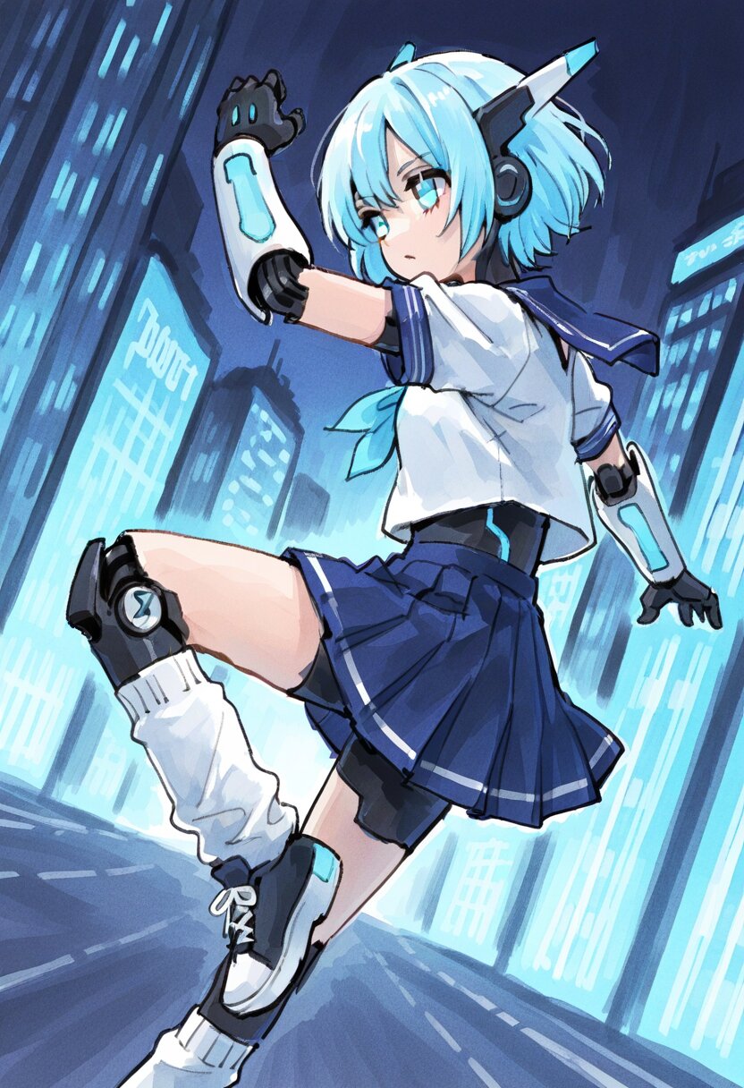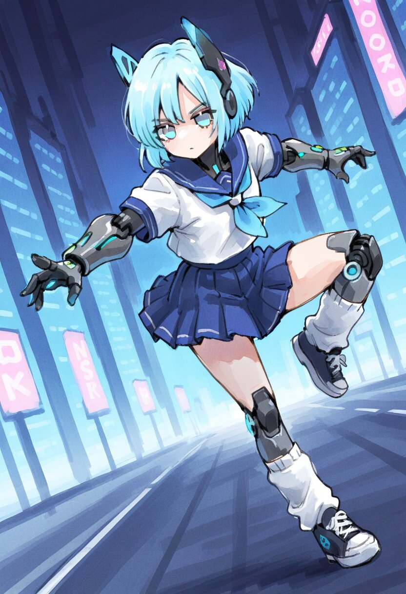 <lora:inmnstyleilxl:0.9>, best quality, masterpiece, very aesthetic, watercolor painting, general, 1girl, solo, action pose, dynamic angle, cyborg, mechanical girl, mechanical arms, mechanical legs, short sleeves sailor suit, pleats skirt, loose socks, sneaker, headgear, glowing blue hair, short hair, glowing light blue eyes, neon cyber city background