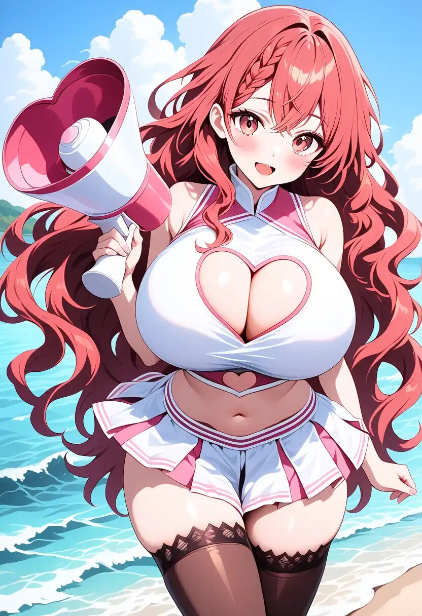 masterpiece, best quality, ultra detailed, 8K, [a large heart cutout is edged in pink]++, [cleavage]++, [Cheerleader costume]++, [midriff]+, [holding megaphone]++, [huge breasts]++, perky breasts, hanging breasts, curvy, bare shoulders, bare arms, [brown thighhighs]++, skindentation, cowboy shot, [legs together]++, BREAK tall, [long hair]++, [shiny]+, [shiny skin]+, [shiny clothes]+, [big eyes]+, smile, blush, open mouth, ocean, beach, outdoors, standing, day, waves, [wavy hair]++,