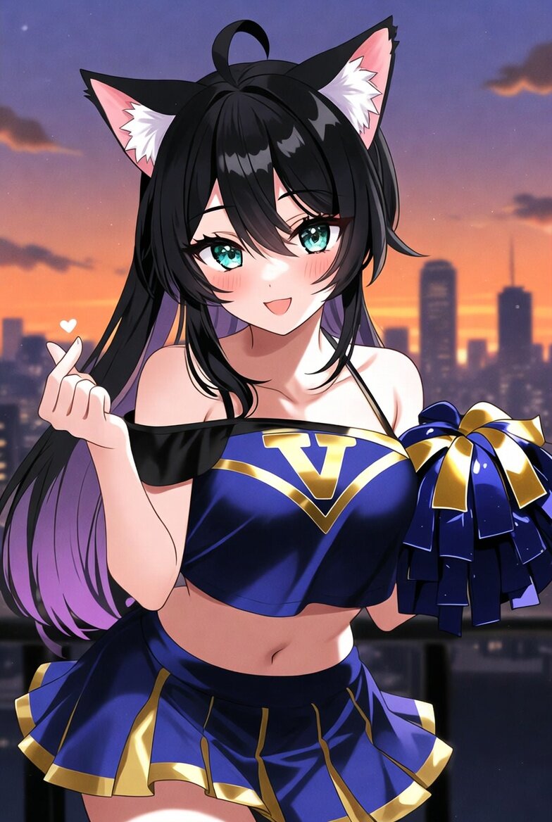 masterpiece, best quality, extremely detailed CG, gentle black long hair with slight purple shine, ponytail, cat ears, soft smile, wearing navy blue × gold cheerleader uniform, off-shoulder crop top, short skirt, holding one pom-pom in hand and making small heart with fingers, twilight city skyline background, sunset orange and purple sky, tired but happy expression,soft rim lighting, slight film grain
