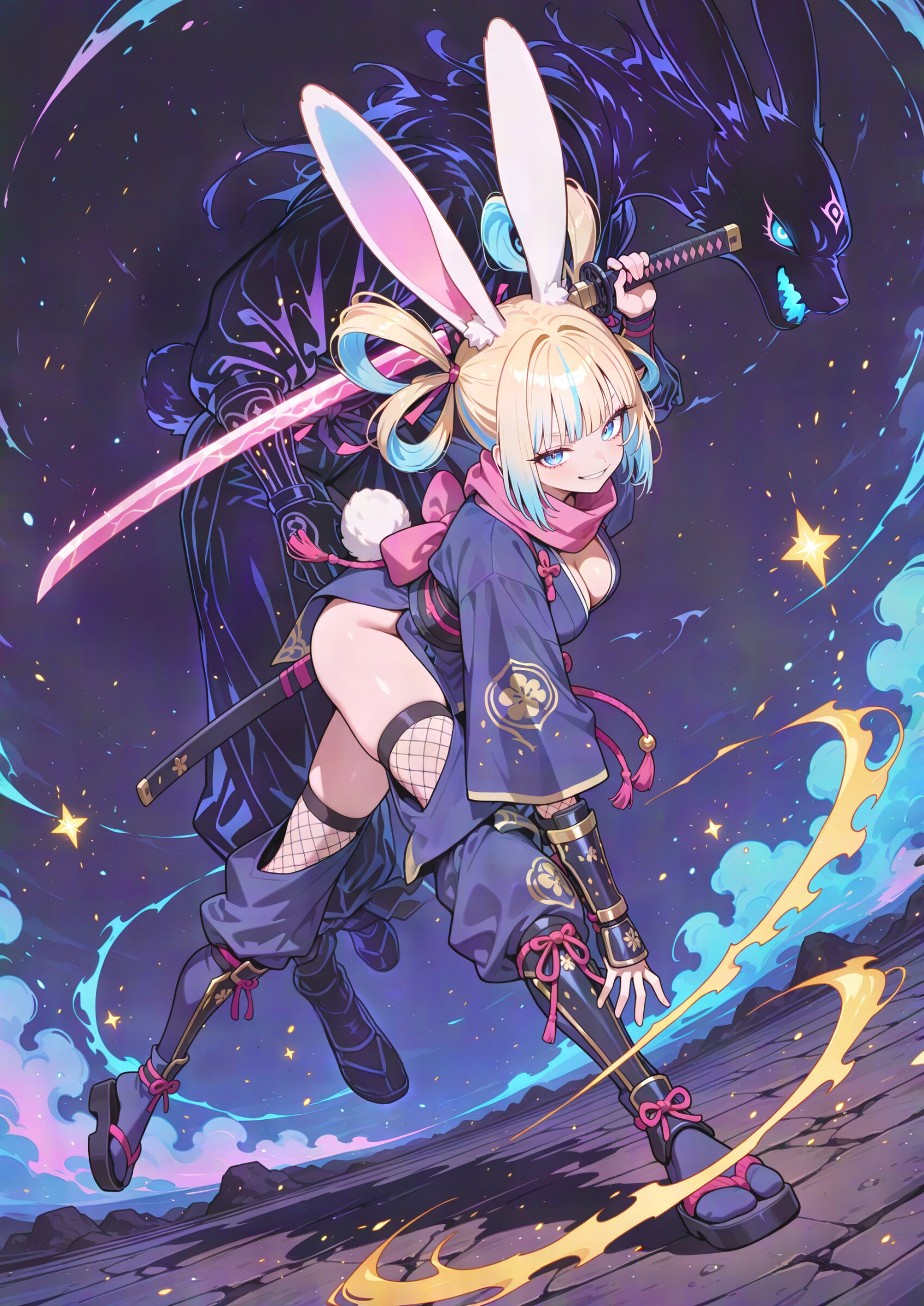 from side, looking at viewer, (fisheye,fisheye lens angle:1.0), focus head , (dutch angle:1.2), weapon focus winter atmosphere, earthy color, glowing pastel colors celadon rabbit energy, pastel colors celadon silhouette of serious rabbit guardian, huge rabbit aura, 1girl, samurai, (muscular female:0.65), two-tone hair, skyblue and yellow hair, prehensile hair, quad tails cut bangs , glowing hair, ,, beautiful cerulean blue eyes large breasts, ,, ninja cloth, short kimono, obijime, fishnet inner, fishnets, fishnet thighhighs, ninja pants,, kote, (ninjutsu:1.1), (floating many shurikens:1.1) , , pink scarf,, zouri, , rabbit ears, rabbit tail, ,, japanese clothes, seductive smile, dynamic pose, kung fu attack, kung fu action, kuji-in, ninjutsu, floating weapon, tantou, henshin, transformation, smoke, (swirling ink effects:1.2) blocking, beautiful metallic luster, sharp katana, ultra detailed pastel colors celadon katana, silver particles, light trail, The background is a solid, bright pastel colors celadon, creating a striking contrast with the intricate, multi-colored design of the character, (dancing silhouette:0.0), pop color background, (high saturation:1.2), drop shadow, subsurface scattering, kicking ink-drenched shadows, solid black shadow blocks, abstract ink swath background, heavy chiaroscuro, high-contrast inky shading, negative space, grunge texture, calligraphic strokes, super fine concept art, unreal engine, graceful eyes, masterpiece, best quality, amazing quality, very aesthetic, absurdres, newest, professional art lots of details, , overexposure, sumie effect style, 4ur4_illu,shiny, glowing, glowing particles, glowing light particles, light particles, light particles, <lora:noline (1):-0.5> <lora:sdxl2-flat2-512b:0.0> <lora:facelightup_xl_v10:0.5> <lora:V2_yakumo_alchemy:0.5> <lora:Aura_illu:0.1>