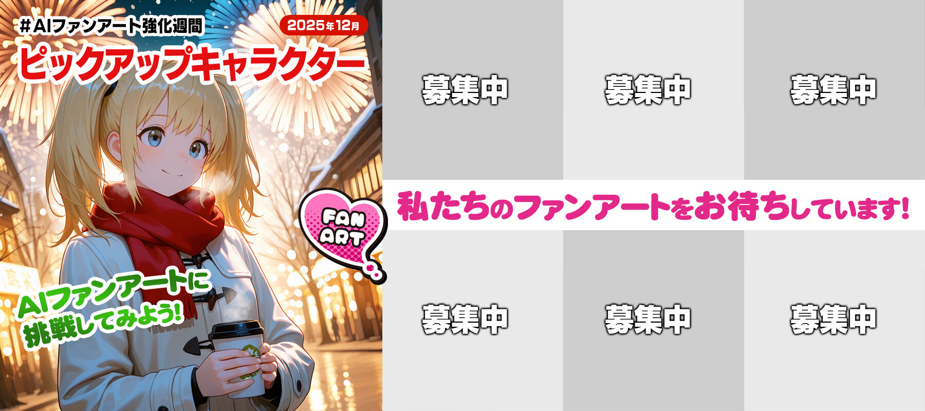 12月15日(月)より開催の #AIファンアート強化週間 では今月もピックアップキャラクター6人を募集します🥰🙌