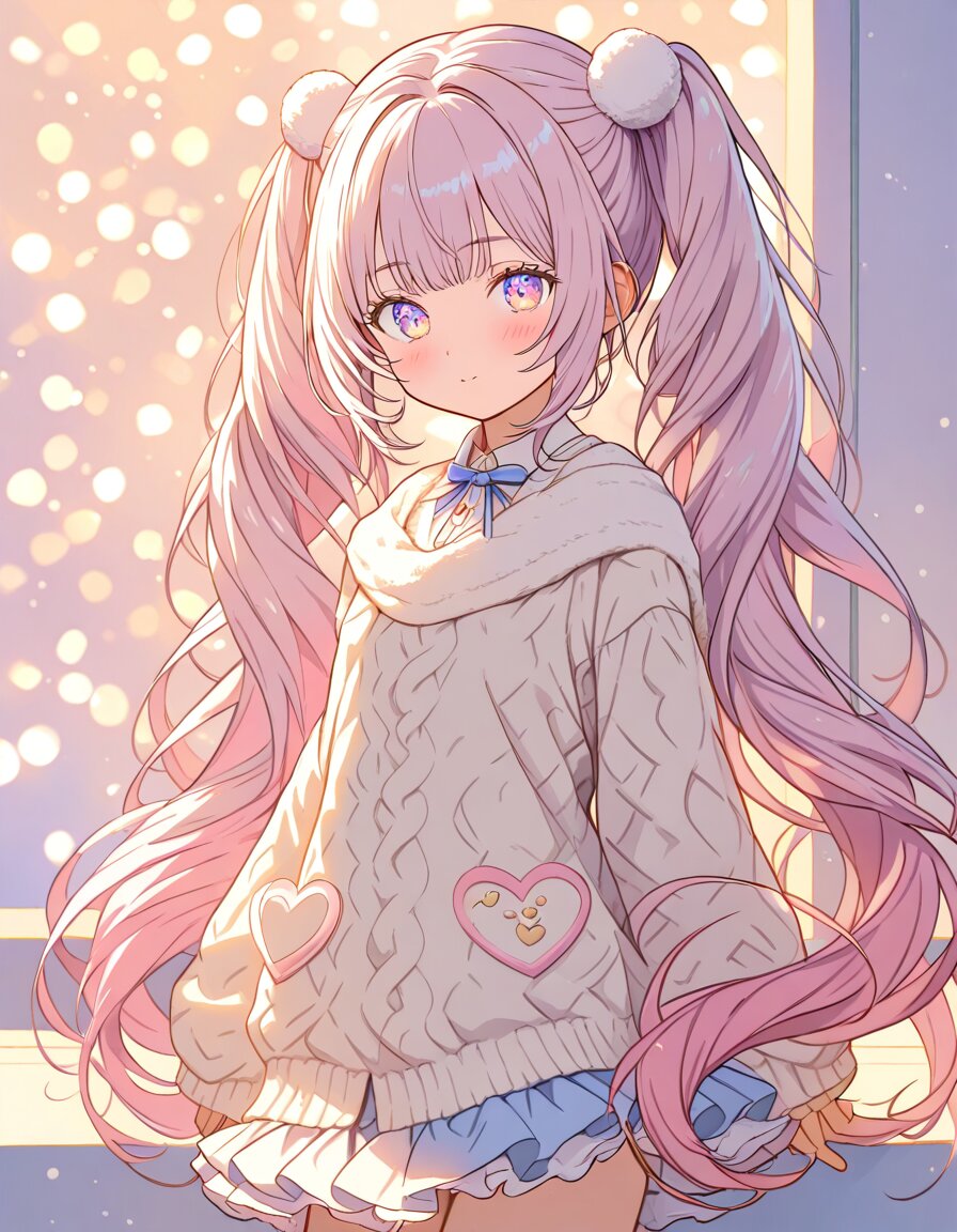 (masterpiece, best quality, ultra detailed, high resolution:1.2), (anime style, clean lineart, smooth gradient shading), ### ライティング(甘く可愛い+自然光) soft lighting, gentle light, diffuse light, warm light, soft glow, subtle bloom, subtle rim light, ambient light, skin glow, soft complexion light, catchlight in eyes, reflective eyes, ### 髪・肌・可愛さ補強 hair shine, detailed hair strands, delicate highlights, glossy hair lighting, fluffy hair, light blush, delicate eyelashes, ### ほんの少しリアル寄り(自然な質感) soft realistic shading:1.1, natural light diffusion, subtle skin texture, realistic eye reflections, more natural color palette, detailed hair texture, fine strands, soft shadow detailing, subtle face contours, soft facial structure:1.05, slightly natural proportions, ### モデル補正 smooth skin:1.1, beautiful detailed eyes, ### --- キャラ要素(ここに追加) --- cowboy shot, flat chest, cowboy shot, kawaii, loli, petite, flat chest, long twintails, pink hair, magical girl, wearing a warm winter knit outfit with soft pastel colors, fluffy knitted sweater, frilly skirt layered with winter fabric, cute ribbons, heart motifs, collared dress design, magical girl style winter costume, holding a heart-shaped staff, pastel-colored staff details, soft knitted accessories, fluffy scarf, cozy winter textures, background filled with bright christmas illumination lights, glowing trees, festive atmosphere, gentle sparkling bokeh, warm holiday colors