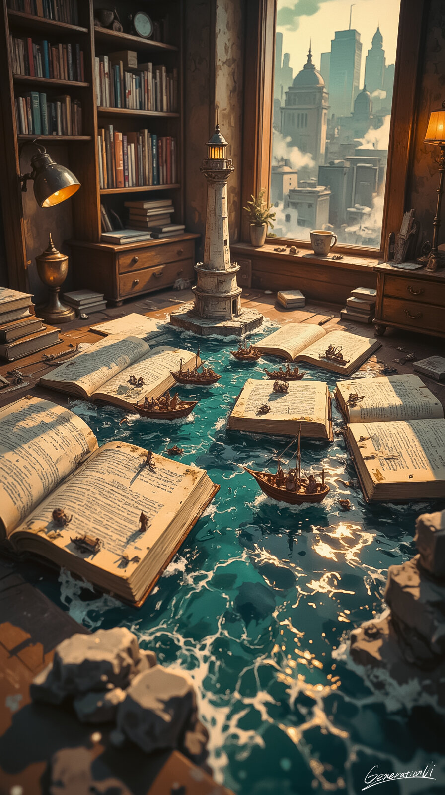 本は海に浮かび、そのあいだを小さな船が進んでいる。