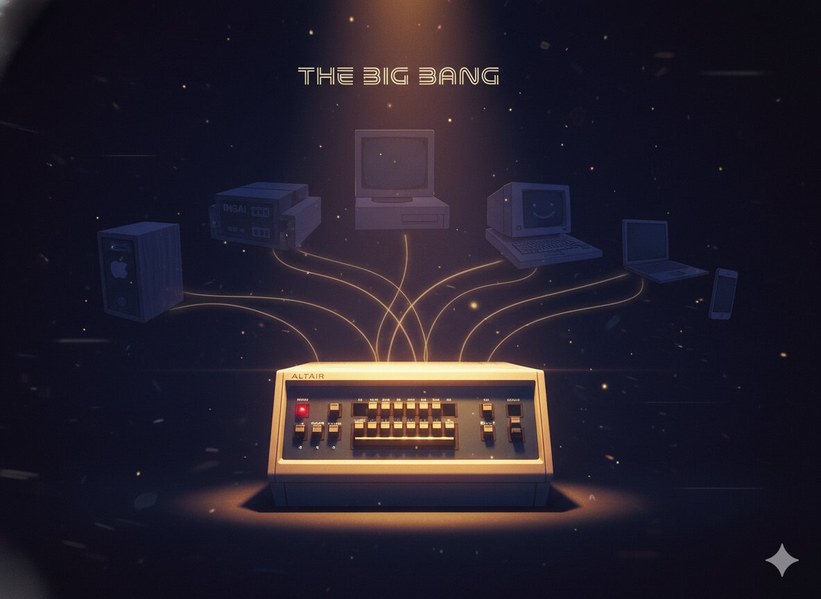A horizontally composed digital painting showing the Altair 8800 computer in the foreground center, illuminated by a soft golden light. Behind it, in a dimly lit background, are silhouettes of iconic computing devices that followed: Apple I, IMSAI 8080, IBM PC, Macintosh, and others. These devices appear as if emerging from shadows, symbolizing the ripple effect of Altair 8800's influence. The scene evokes a sense of historical continuity and the butterfly effect, representing the technological Big Bang sparked by Altair 8800.