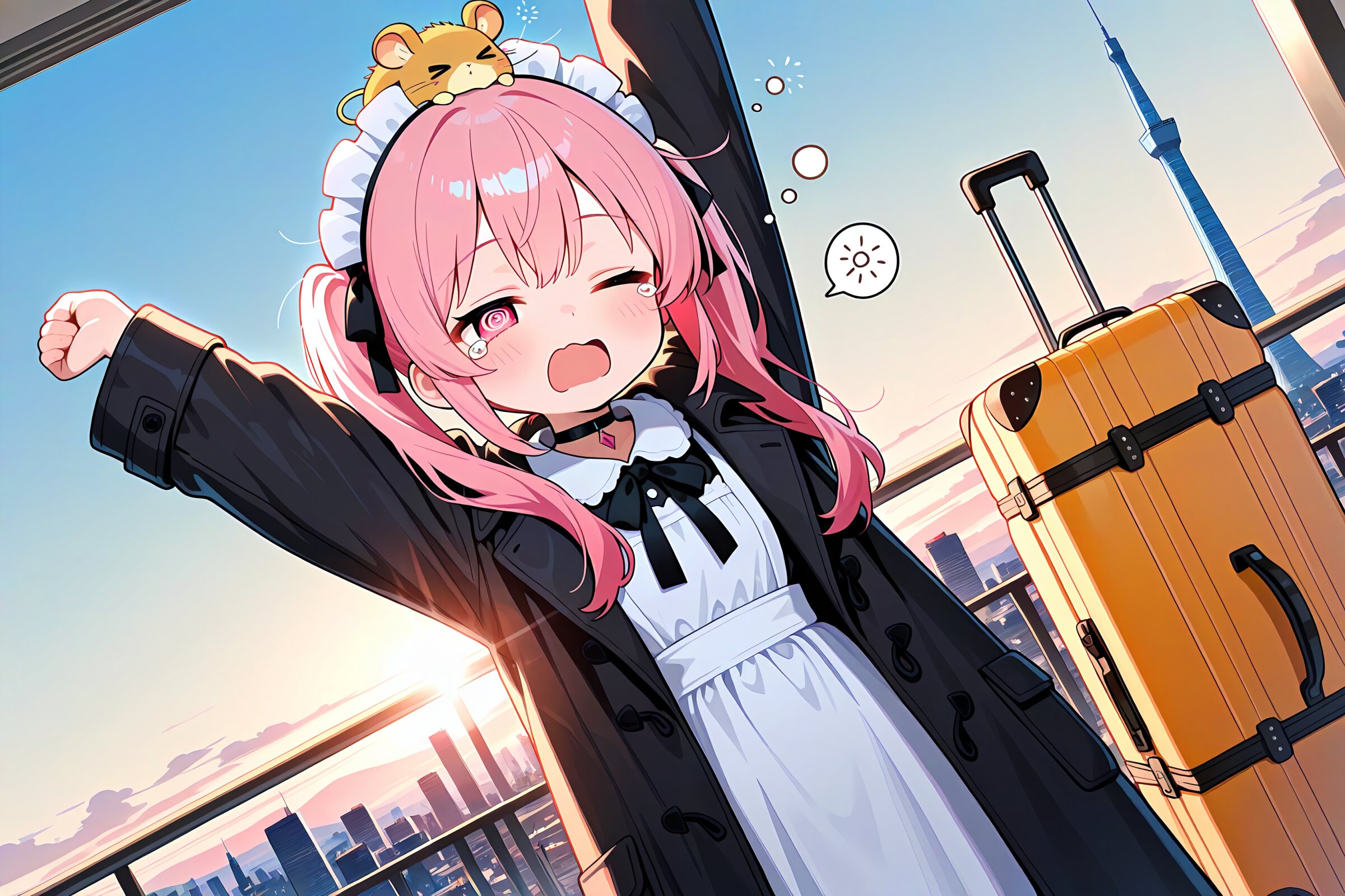 1 little girl, solo, diagonal angle, masterpiece, best quality, amazing quality, very aesthetic, pink hair, twintails, pink eyes, =_=, @_@, sleepy, tearful, squeans, spoken squeans, yawning, stretching, choker, maid outfit, long skirt, long coat, scarf, huge rolling suitcase, hamsters on her head, > <, morning, sunshine, winter clear sky, tokyo skytree,