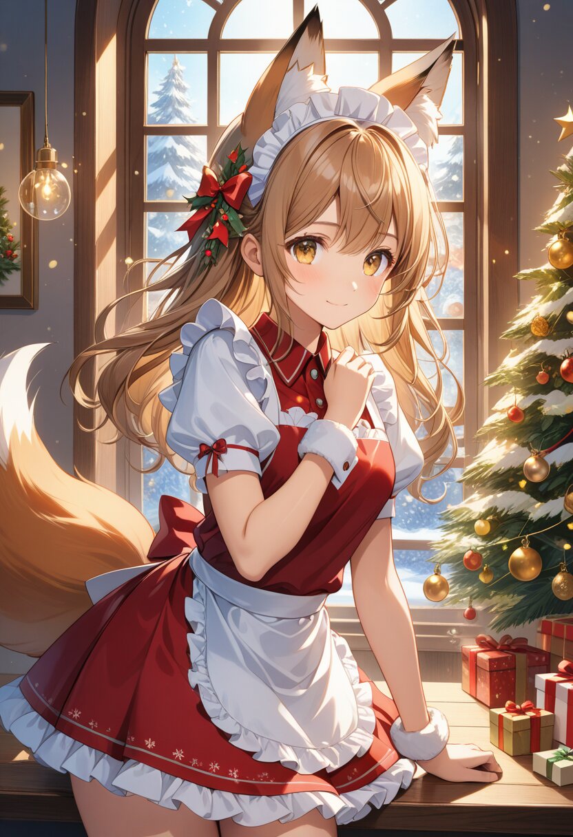 (high resolusion,illustration,ultra detailed 8k art,extremely detailed CG,official art,clothes reflecting light,detailed shiny skin,detailed background:1.3), ((highly detailed beautiful face and eyes),anime_style, fox_ears, girl, light_brown_hair, double_eyelids, long_eyelashes, fluffy_tail, christmas_theme, maid_outfit, apron, lace_trim, festive_decorations, sparkling_lights, cheerful_expression, playful_pose, charming_scene, expressive_eyes, delicate_features, soft_lighting, warm_color_palette