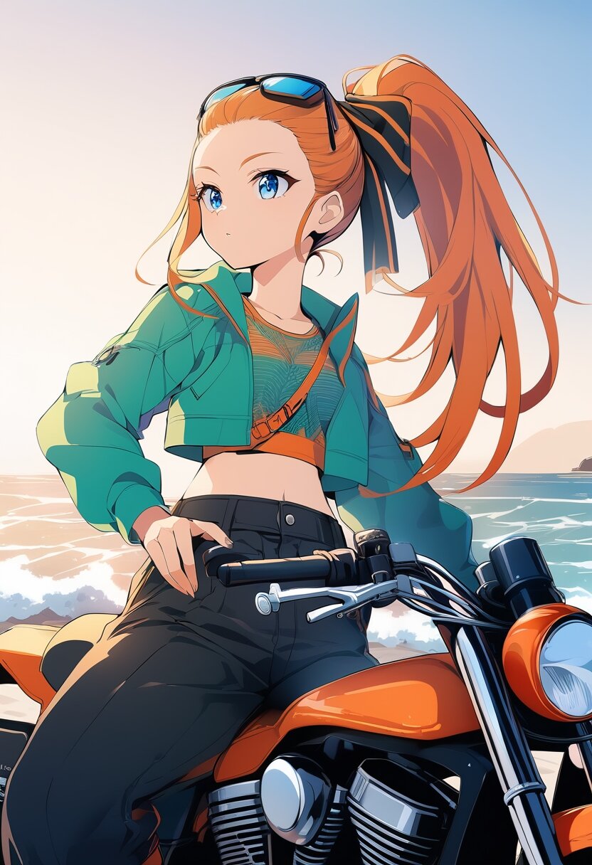 Highly detailed, vibrantly colored, anime-style, 1girl, 15years old, sunglas ses on the top on head, long hair, orange hair, (hair pulled back), ponytail, blue eyes, green midriff jacket, black tethered pants, boots, cowboy shot, sitting on motorcycle sheet, seaside, face focus,