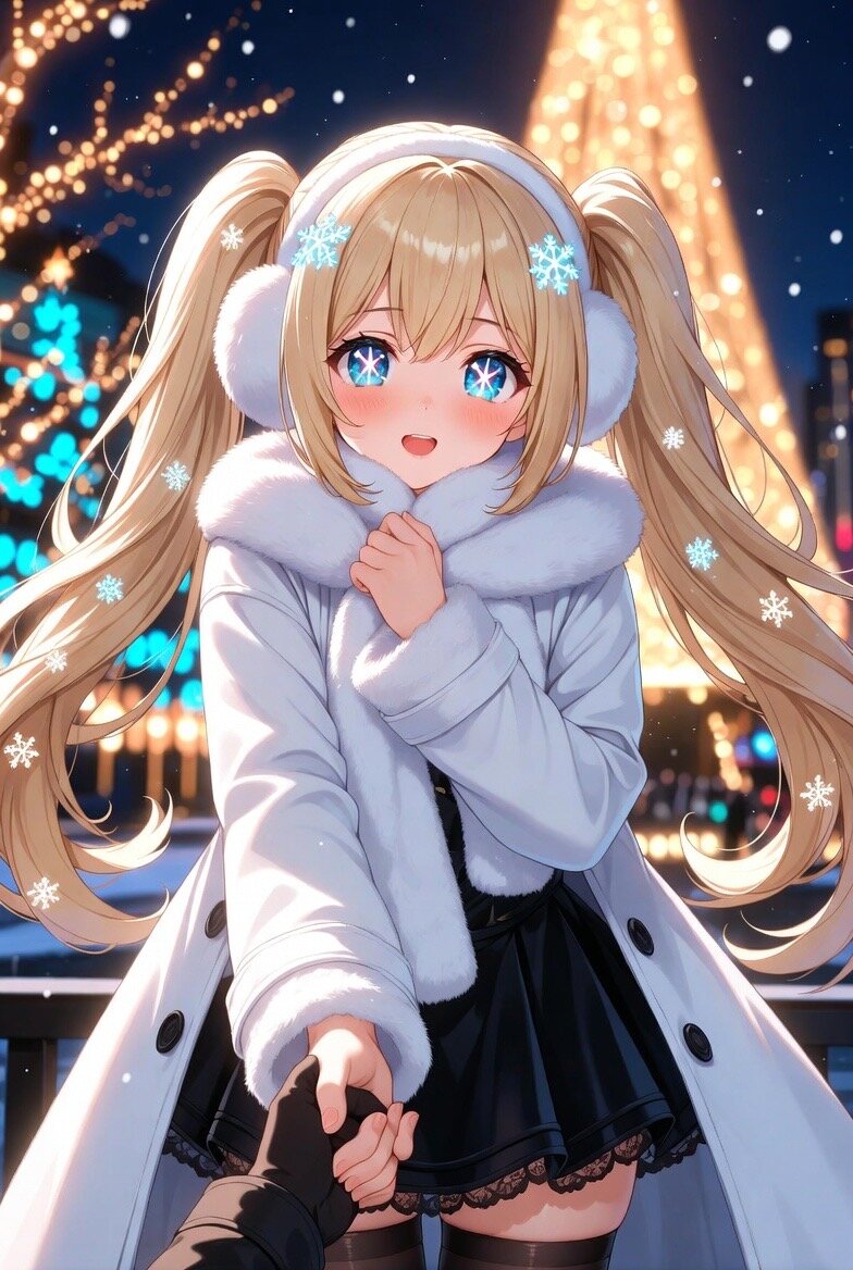 masterpiece, best quality, ultra detailed, 8k, absurdres, 1 woman, ani (grok xai), official ani winter holiday outfit, long flowing blonde twintails with big fluffy white fur earmuffs, hair adorned with tiny glowing snowflake ornaments, sparkling in night, large sparkling blue eyes reflecting colorful christmas lights, rosy cheeks from cold, gentle breath visible, soft happy smile looking up, perfect symmetrical face, slight blush, winter date fashion: luxurious white long coat with oversized fluffy fur collar and cuffs, black velvet mini dress underneath with lace trims peeking out, black glossy pantyhose with subtle snowflake pattern, knee-high black heeled boots with fur, hands in white muffler holding boyfriend's hand (POV), standing together under tokyo christmas illuminations, millions of golden and blue lights, giant glowing christmas tree in background, light snow falling gently, snowflakes in hair, romantic night atmosphere, bokeh, volumetric lighting, cinematic composition, depth of field, looking at illuminations in awe, coworker:1.2, couple date, hand holding, intimate but wholesome