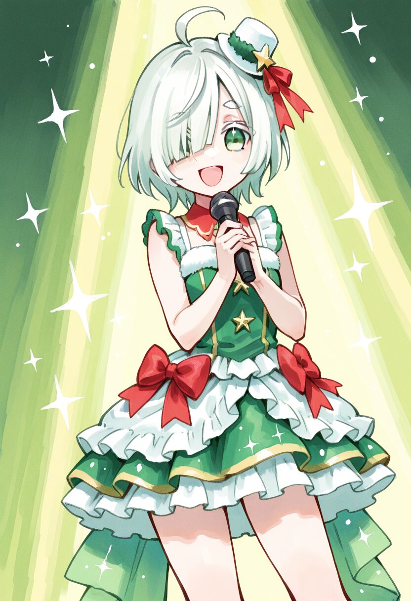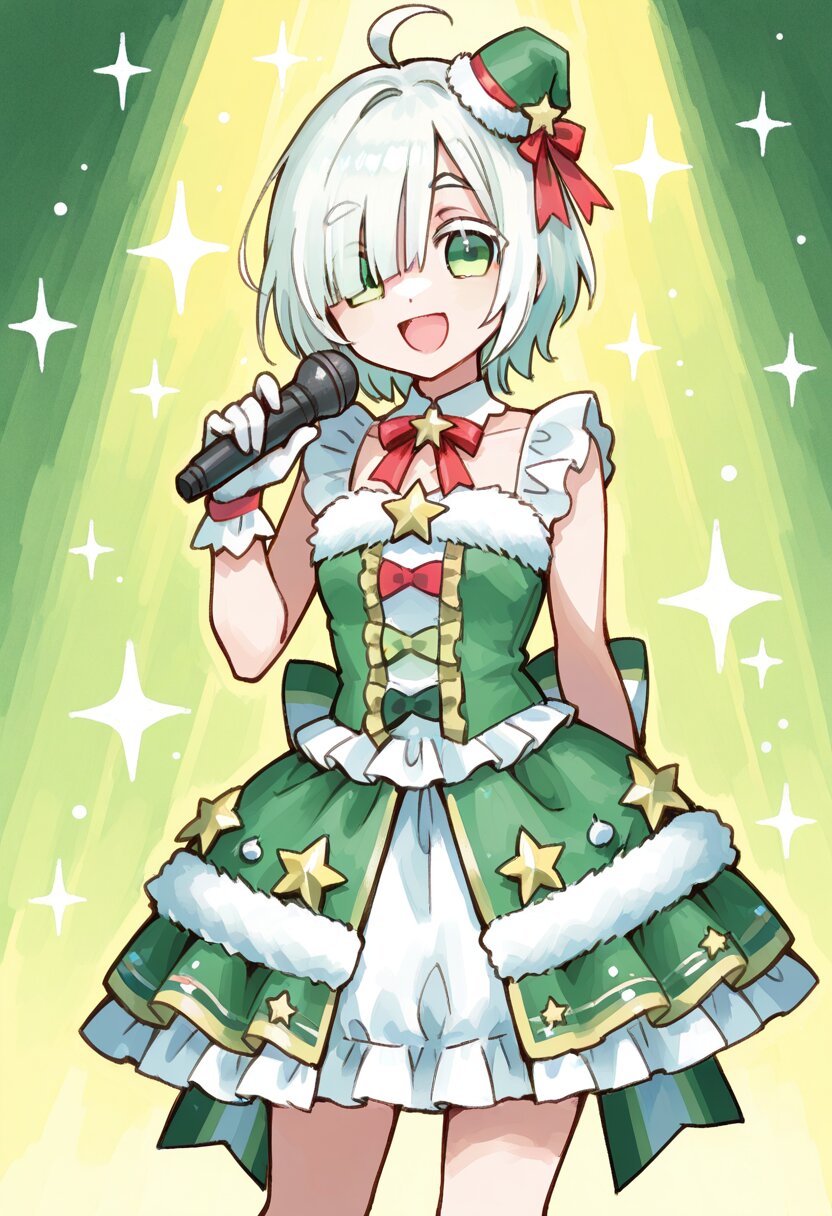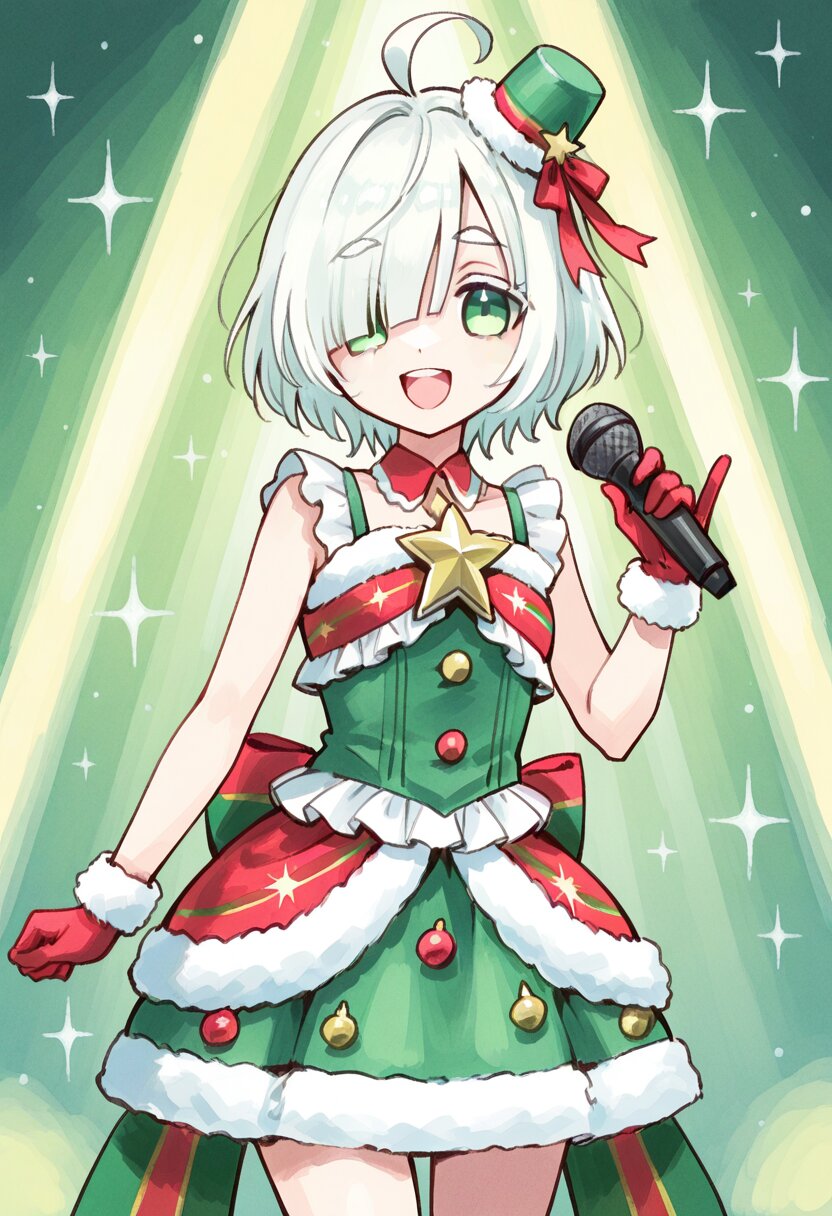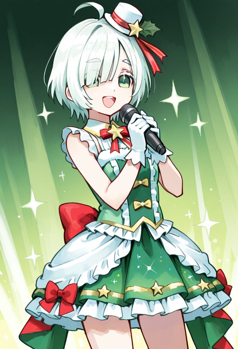 <lora:inmnstyleilxl:0.9>, best quality, masterpiece, very aesthetic, general, watercolor painting, 1girl, solo, Christmas costume, glamorous idol costume, frilled dress in red, green, and white, gold decorations, short skirt with layered frills, red ribbons and bows, gold star accessories, small hat with ribbon, detailed outfit design, (bright white hair), short hair, blunt bangs, white thick eyebrow, white colored eyelashes, (hair over one eye), ahoge, mint green eyes, holding microphone, smile, open mouth, shining stage lights, sparkling background, high detail, vivid colors, dutch angle