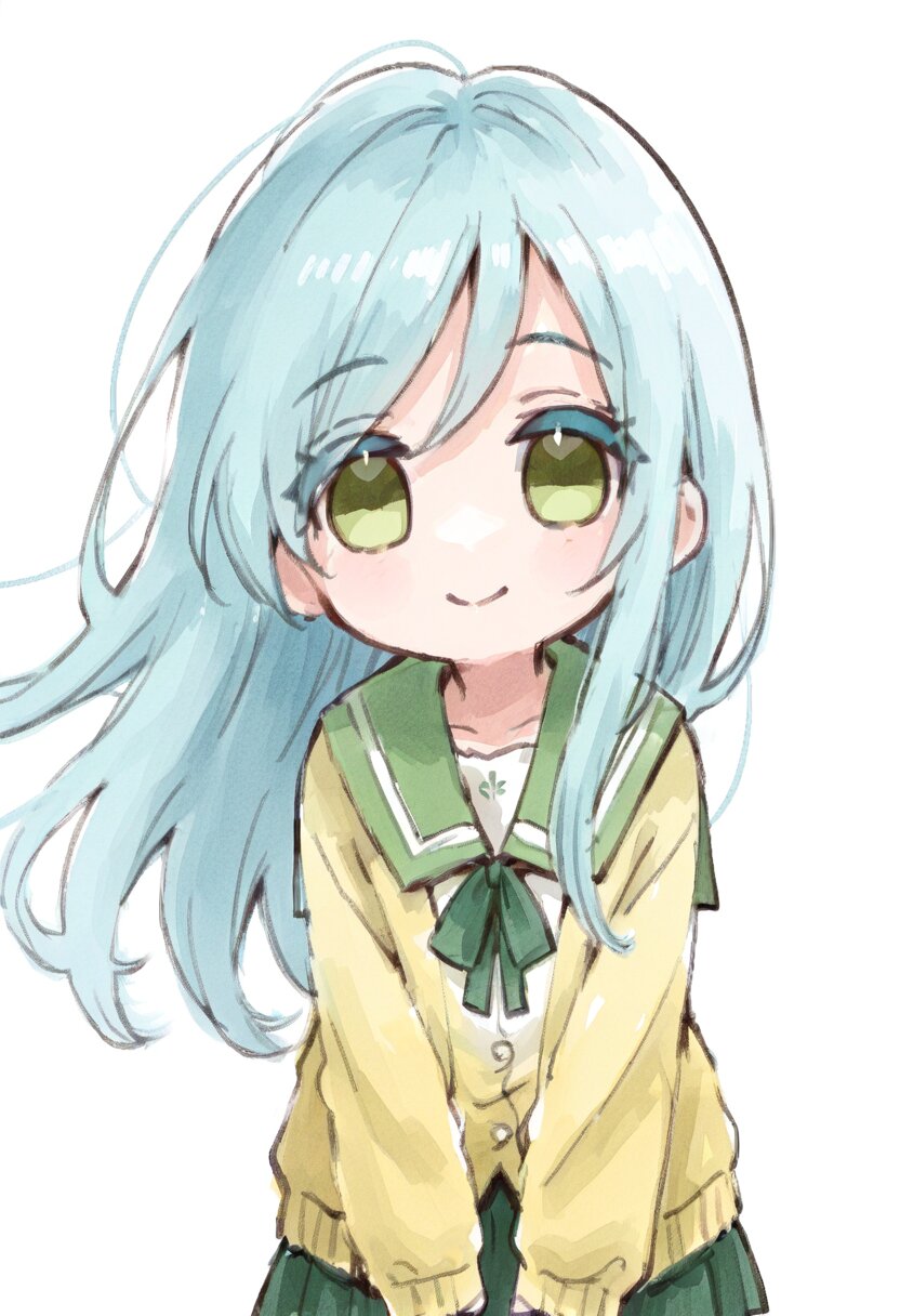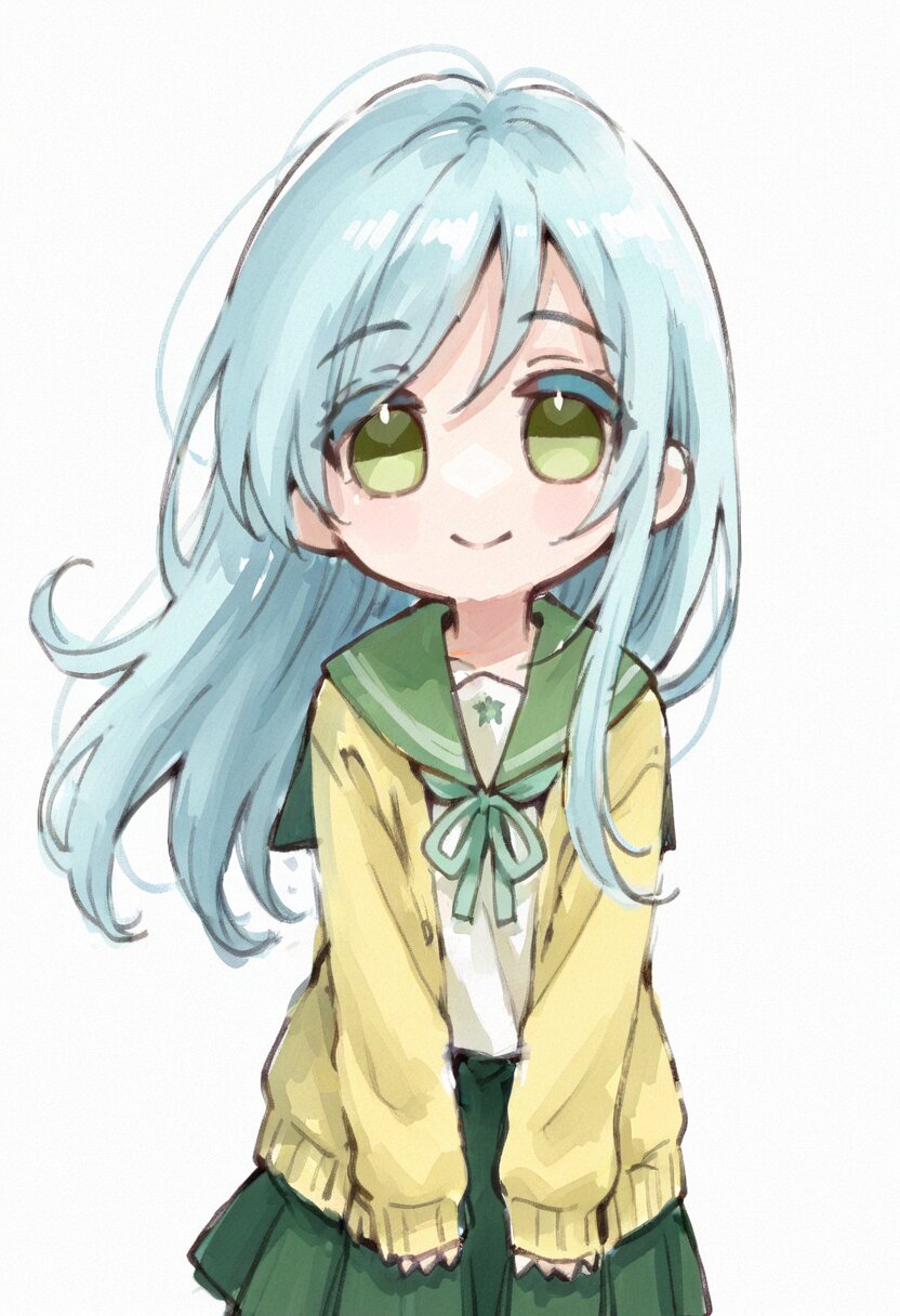 <lora:inmnstyleilxl:0.9>, best quality, masterpiece, very aesthetic, watercolor painting, general, 1girl, chibi, solo, learning forward, straight-on, upper body, sleeves past wrists, light blue hair, long hair, floating hair, green eyes, smile, yellow cardigan, green sailor collar, white tops, green pleats skirt, light blue chest ribbon, white background