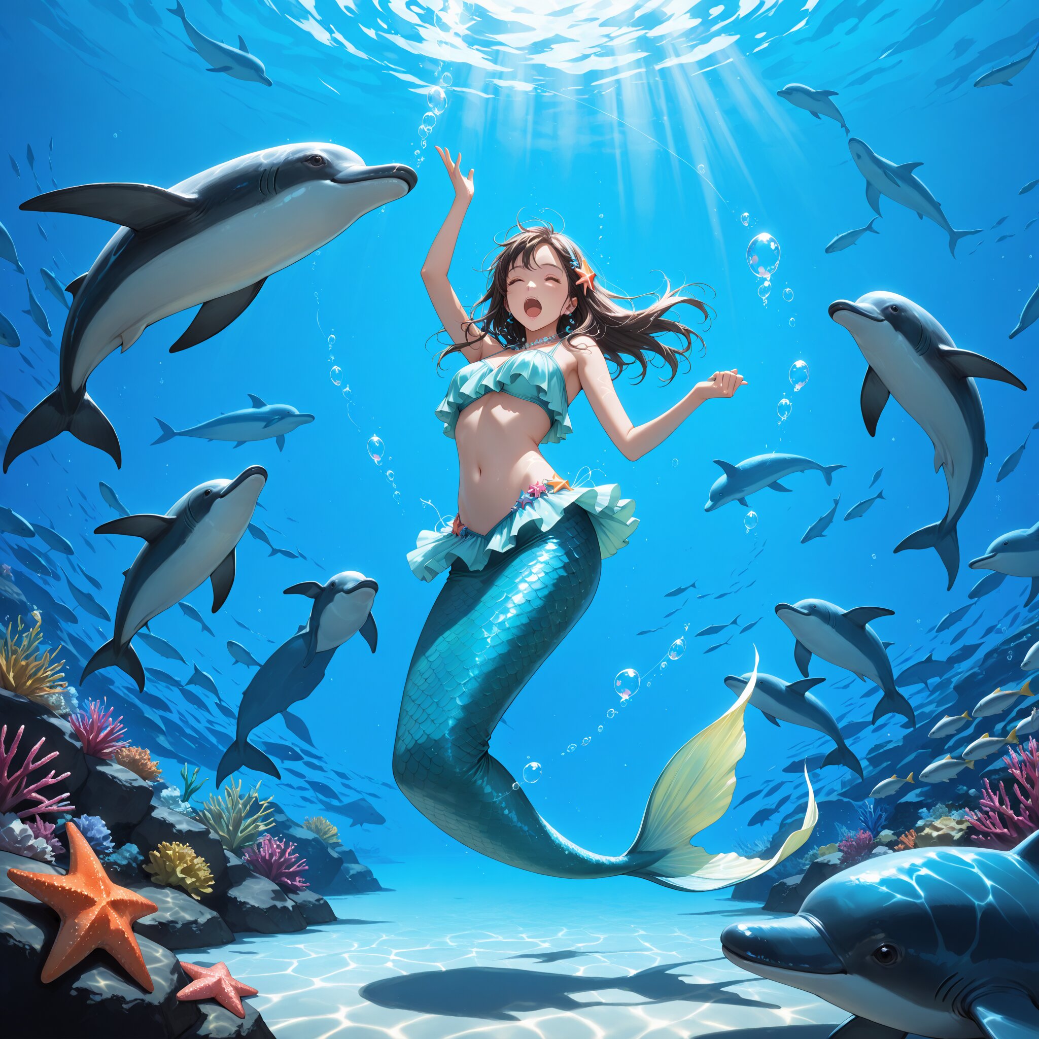 masterpiece, best quality, photorealistic, sharp focus, cinematic lighting, depth of field, beautiful composition, vibrant colors, ultra high res, 8K, highly detailed, masterpiece, best quality, very detailed, masterpiece, best quality, ultra detailed, 1girl, solo, beautiful mermaid, iridescent scales, fin ears, long flowing hair, sitting on a coral rock, underwater, playing harp, shell harp, surrounded by colorful tropical fish, sea turtles, bubbles, sunlight beams, caustics, happy, smiling, elegant, fantasy art, dreamy atmosphere, cinematic lighting