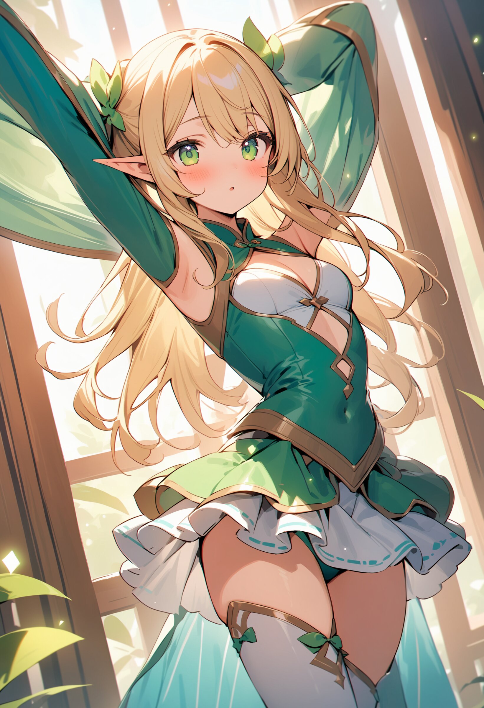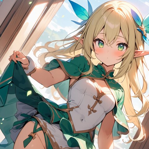 ((masterpiece)), ((best quality)), ((kawaii)), cute, (lovely), ((extremely detailed)), (beautiful), dynamic angle, a cute girl, 1girl, solo, ((elf )),beautiful blond hair, beautiful green eyes, ((beautiful eyes)), long hair, fantasy clothes,