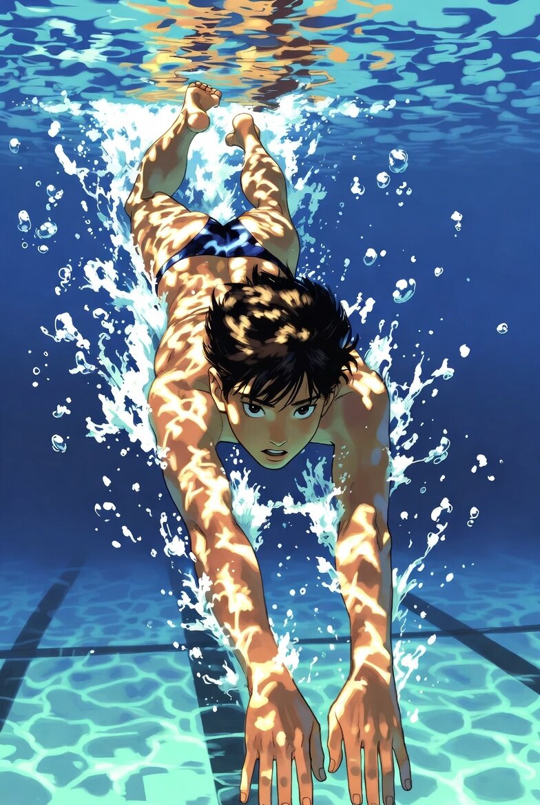 A digital illustration of a Japanese male high school student swimming breaststroke in a pool, with dynamic water and sunlight.