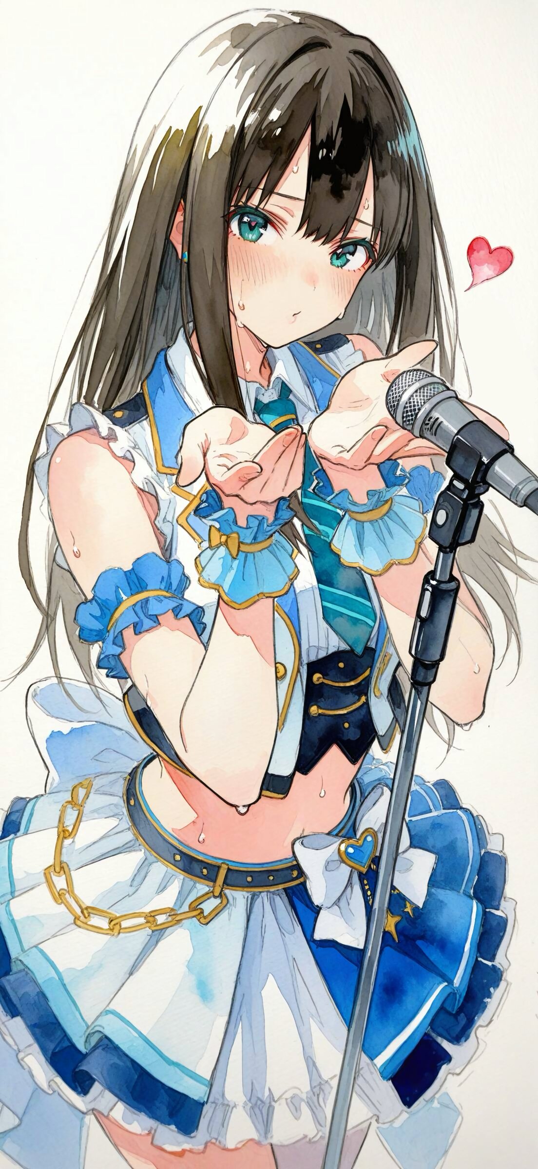 high quality, 1girl, (traditional media),(pencil sketch style),(watercolour painting),midriff baring,idol costume, blowing kiss,looking viewer,dynamic angle,depth of fields,sweat,heart,detailed eyes,detailed hands,shibuya rin,shy, microphone stand