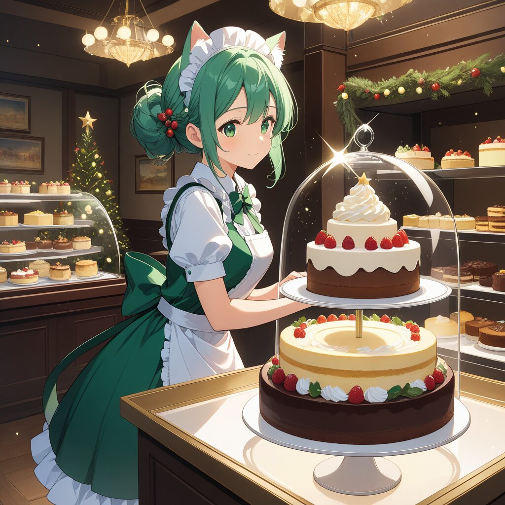 Sparkle, shortcake in the display case, the profile of a cat-eared girl in a maid outfit, cheesecake, chocolate cake, cakes beautifully displayed in a cake shop. Christmas season, sparkling particles of light dancing, sparkle, the red, green, and blue haze of Christmas, a faint smile.(line art: 1.5), a toy box, silver and dark green tones (familiar face) (anime style).