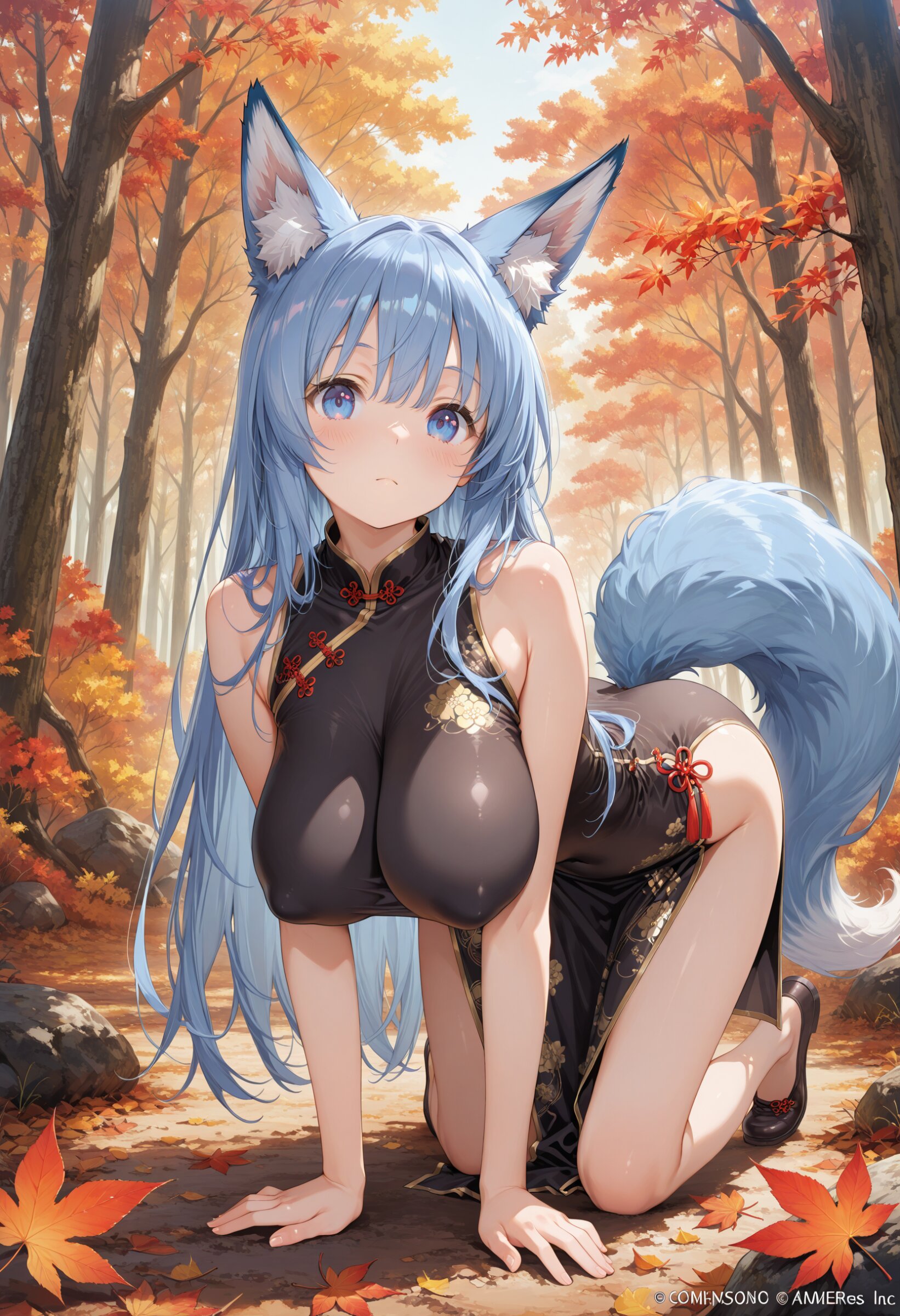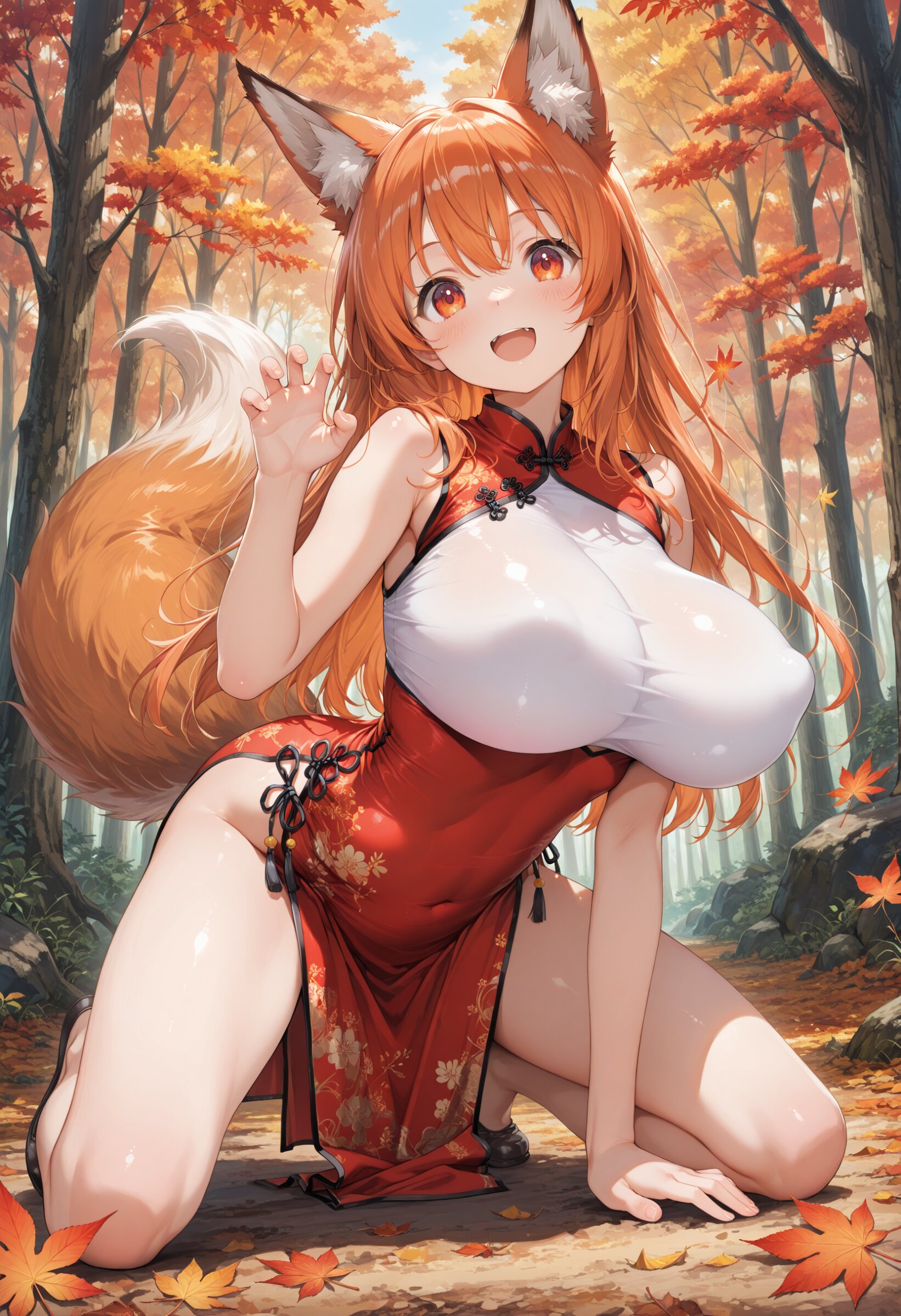 masterpiece, best quality, amazing quality, general, fine detail, official art, 1girl, loli, petite, fox ears, fox tail, silver hair, white china dress, slim legs, huge breasts, (perky breasts:1.2), impossible clothes, loli, on all fours, from front, look at viewer, in forest, autumn, happy, (claw pose:1.2),