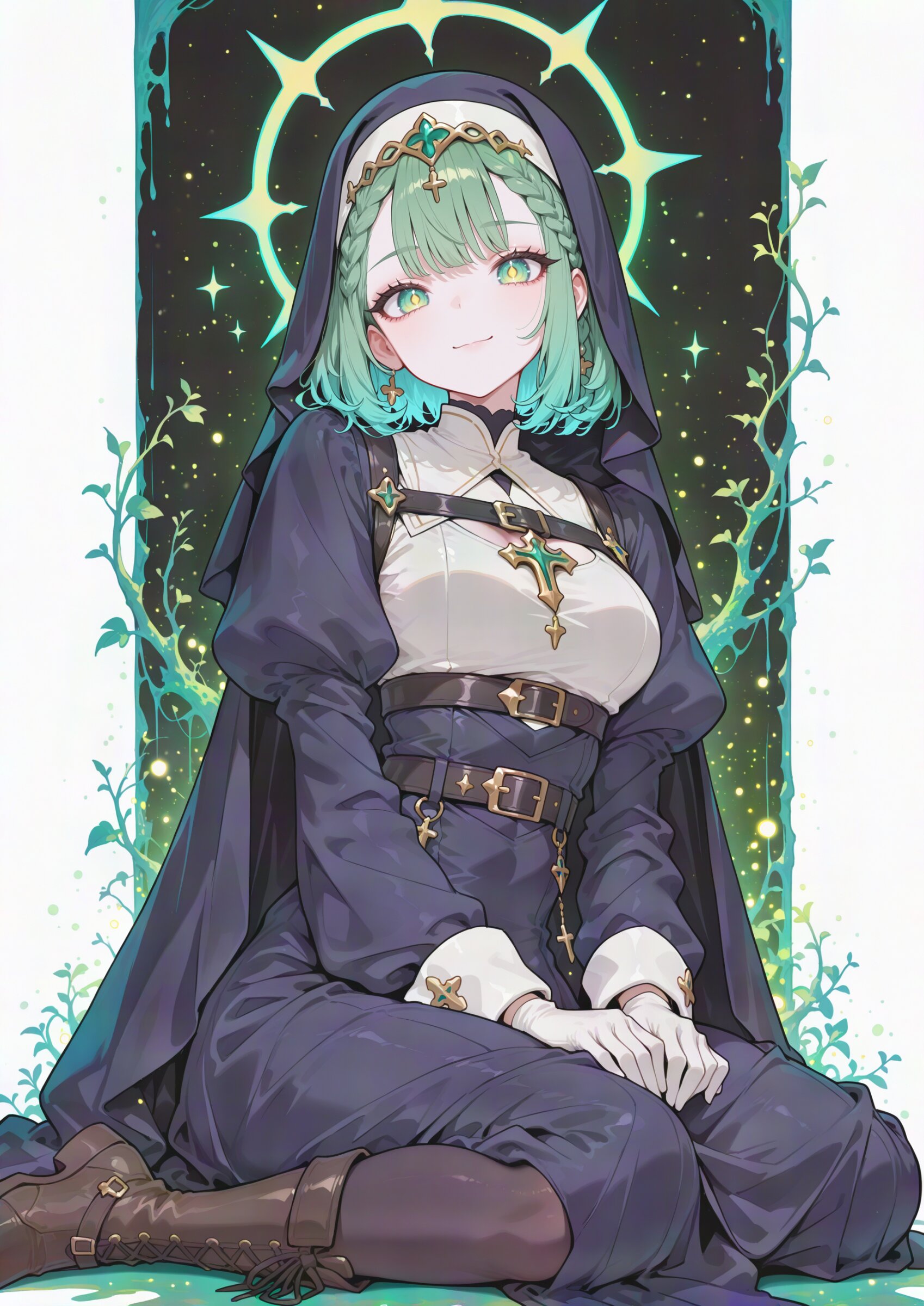 from side close to viewer (low angle shot:1.15) , looking at viewer, (simple transparent background:1.1), drop shadow, colored shadow, 1girl, nun, beautiful detailed eyes, holy face, cool Elegant and sophisticated demeanor, (pale skin:1.0), skindentation, beautiful moss green eyes, cephalopod eyes , two-tone hair, ever green and darkmagenta hair, short hair, braid,braided bangs , soft hair, first-rate female bodies perfect body beautiful very long breasts medium hips, narrow waist, solo, nun, Good texture circlet, black simple cape, cloak, black hallowed Coat, juliet sleeves, the feel of rough, , belt buckle, chest belt, , white gloves, , long skirt, (silk overskirt:1.0), black pantyhose, knee boots, compassionate expression, empathetic, caring, kind, (soft smile:1.1), wariza super fine concept art, hard surface, 8K, masterpiece, best quality, amazing quality, very aesthetic, absurdres, professional art lots of details, , overexposure, shiny-glistening, (watercolor style:1.0), (pastel color style:0.5) 4ur4_illu,shiny, glowing, glowing particles, glowing light particles, light particles, <lora:noline (1):1.0> <lora:sdxl2-flat2-512b:0.15> <lora:facelightup_xl_v10:0.5> <lora:V2_yakumo_alchemy:0.5> <lora:Aura_illu:0.1>