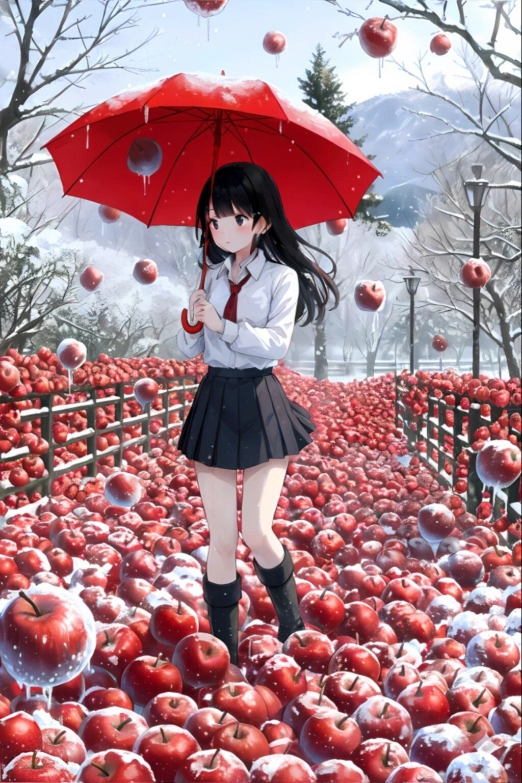 In a snowy winter landscape, a black-haired high school girl holding a red umbrella walks through a pile of frozen apples on the ground. In the background, snow-covered trees and mountains can be seen, and frozen apples are falling from the sky. The girl looks a little confused.