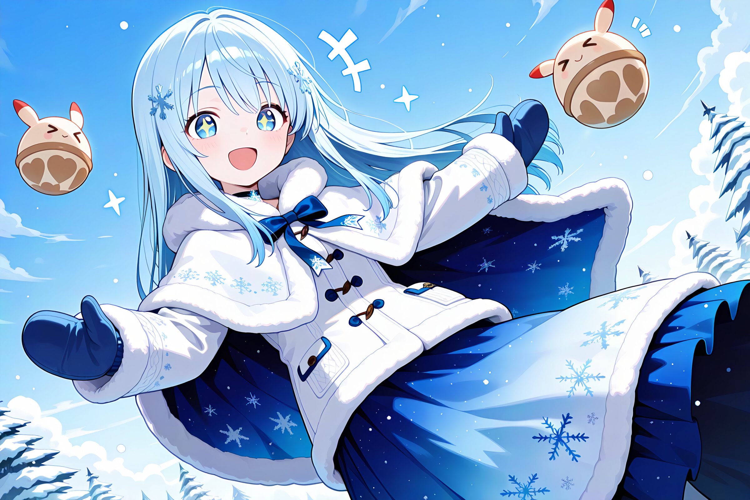 1 little girl, solo, diagonal angle, masterpiece, best quality, amazing quality, very aesthetic, sky blue hair, long hair, straight hair, blue eyes, +_+, open mouth, smile, cheerful, +++, notice lines, choker, mittens, dynamic pose, humpty dumpty, > <, winter-themed outfit, white and pale blue color scheme, layered fabric clothing, soft wool cape, snowflake embroidery, fur-trim accents, long skirt, ribbon details, cold-weather attire, gentle winter aesthetic,