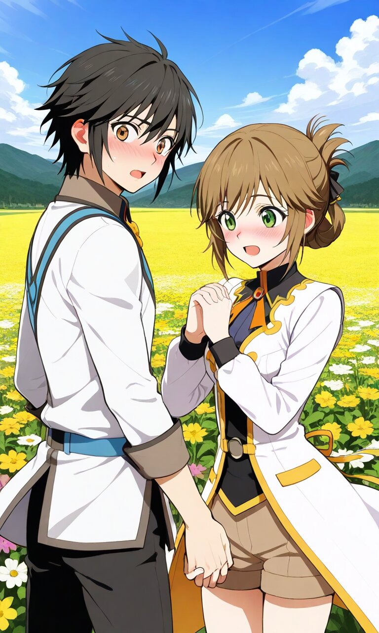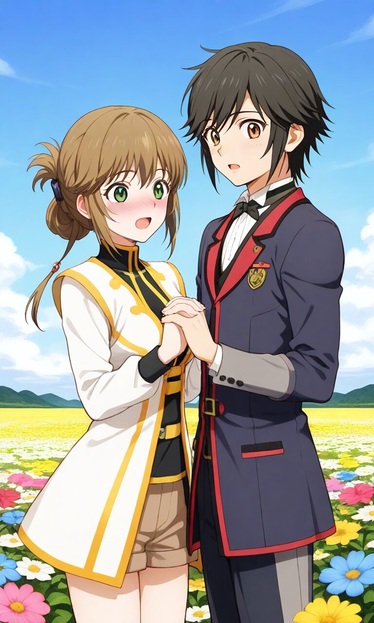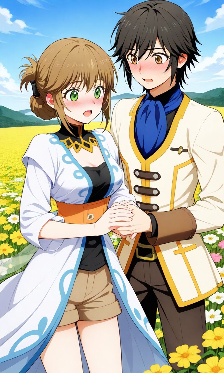 Couple, boy and girl, two people only,absurdres, ultra-detailed, master piece, high resolution, 8k, Boy, girl, couple,NSFW, masterpiece, best quality, extremely detailed, beautiful detailed girl , blushing confession expression, standing in colorful flower field under blue sky, boyfriend with surprised joyful face holding her hands, romantic post-ending atmosphere, perfect anatomy BREAK the boy(Jude Matisse, black hair,brown eyes,) BREAK the girl(leiax2, brown hair, green eyes, tied hair, sidelocks, short hair, )