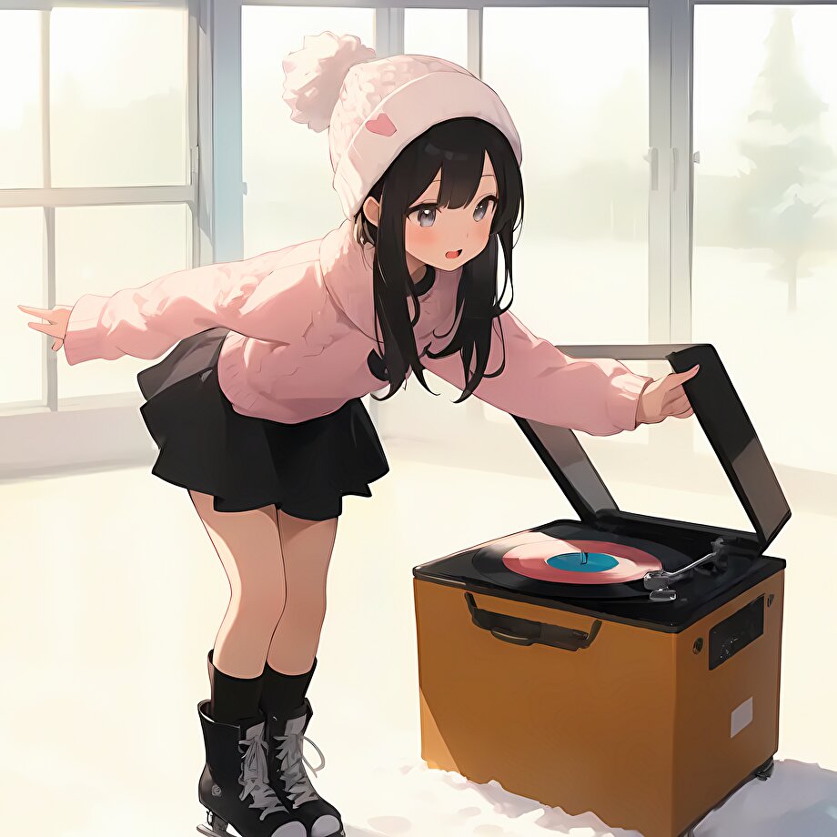 masterpiece, best quality, 1girl, kawaii, loli, Ice skating, putting on boots, knitting, knit cap, Playing a record, Drop the needle on the record, Placing the record on the turntable, Ice skating rink, in skating gym, windows, sunshine in winter,