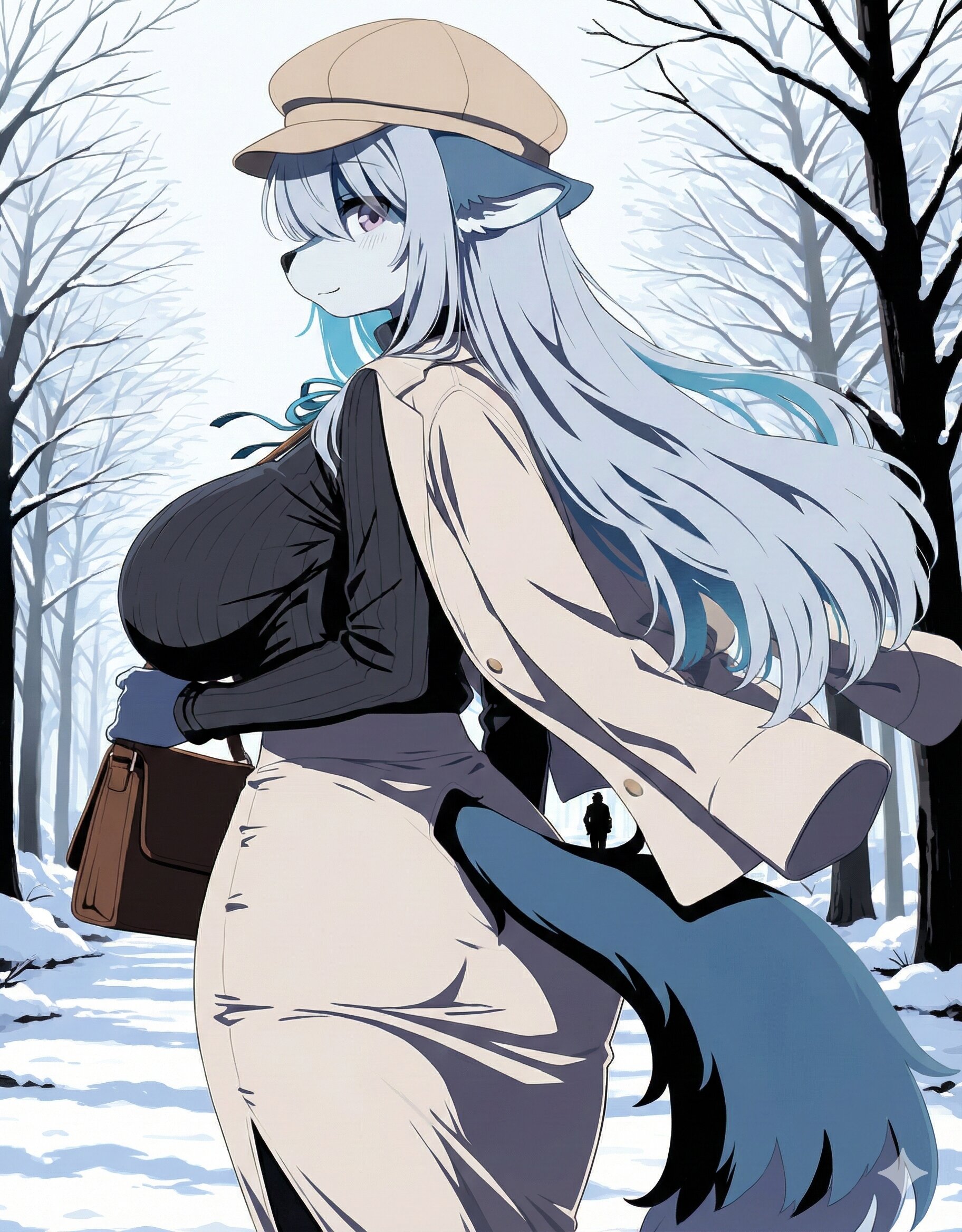 1girl,(wolf girl),(furry female),(snout:1.3),blue fur,wolf ears,ears up,wolf tail,body fur,fluffy fur,(gigantic breasts),sagging breasts,slim,narrow waist,wide hips,thick thighs,silver hair,hime-cut,long hair,colored inner hair,hair over eyes,hair between eyes,silver eyes,long bangs,expressionless,unemotional,closed mouth,light-smile,newsboy cap,beige cap,revealing clothes,undersized clothes,blue neck ribbon with loose ends,revealing clothes,undersized clothes,layering,separated jacket and sweater,white jacket,jacket on shoulders,high collar,black collar,turtleneck,black sweater,long sleeves,white skirt,pencil skirt,long skirt,black pantyhose,holding a shoulder bag,from behind,walking,profile,turning head,looking back,snow background,hair shade,((high contrast)),(digital art:1.1),(anime coloring),(kawaii),softy,(2D),(cute),furry,(two tone fur),(furry body),perfect body,detailed face,high quality,cute clothes,animal tail,animal ears,solo,masterpiece,((correct_anatomy)),pretty and cute, comical, simple, anime,Bright colors, Contour line, pale painting,gddw,(detailed_hands:1.5),flat color, no lineart,close-up,eye focus