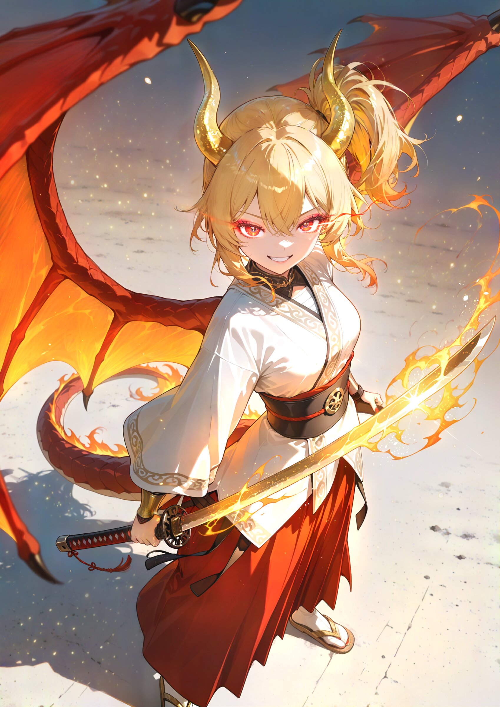 (portrait:1.0) (from above,looking up:1.0) medieval japanese fantasy world, red desert, arabian,(gradient sky clear weather, feverish,heat haze),, sumi-e, faux traditional media, color ink \(medium\), painting \(medium\), calligraphy brush (medium), monochrome, spot color, 1dragon girl, solo, dragon girl, 18yo, (2dragon gold horns attached to the head:1.2), (blonde hair:1.2) medium hair half updo hair up (side ponytail:1.3), red eyes beautiful iridescence eyes, (eyeshadow:1.2), cute, beautiful, (muscle,buff well-built body,ultra-detailed muscle:0.6) , first-rate female bodies perfect body framed breasts smart hips Average height, red nail polish, a dragon tail (2long red dragon wings on back:1.2), (red hakama:1.0) (overskirt:1.0) (White Japanese Clothes:1.0), sarashi inner, (White wide sleeve:1.0) gold and white stripe obi, bracer, straw sandals, tabi, (shiny smile), clenched teeth, eye trail,, glowing japanese sword, (japanese sword action:1.1), point katana at viewer glint, leaning back w, (swirling red energy,energy magic,energy:1.2), glowing eastern dragon red aura, (swirling black ink effects:1.2) dynamic action, , black motion blur, An illustration with line art drawn using a brush, featuring dynamic movement lines expressed with thick sumi ink strokes. super fine concept art, hard surface, graceful eyes, masterpiece, best quality, amazing quality, very aesthetic, absurdres, newest, professional art lots of details, , overexposure, sumie effect style, 4ur4_illu,shiny, glowing, glowing particles, glowing light particles, light particles, shadow, <lora:noline (1):-0.5> <lora:sdxl2-flat2-512b:0.2> <lora:facelightup_xl_v10:0.5> <lora:V2_yakumo_alchemy:0.5> <lora:Aura_illu:0.1>