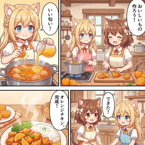 この子たちが猫たちと一緒に観光バスの中に乗っている。添付画像のふたりの表情は画像のまま。 みんなでバスの窓から楽しそうに顔を出している。運転手の猫は帽子を被っている。 バスには猫の意匠が施されている。バスは海沿いの道路を走っている。 背景には海と山。デフォルメのイラスト。