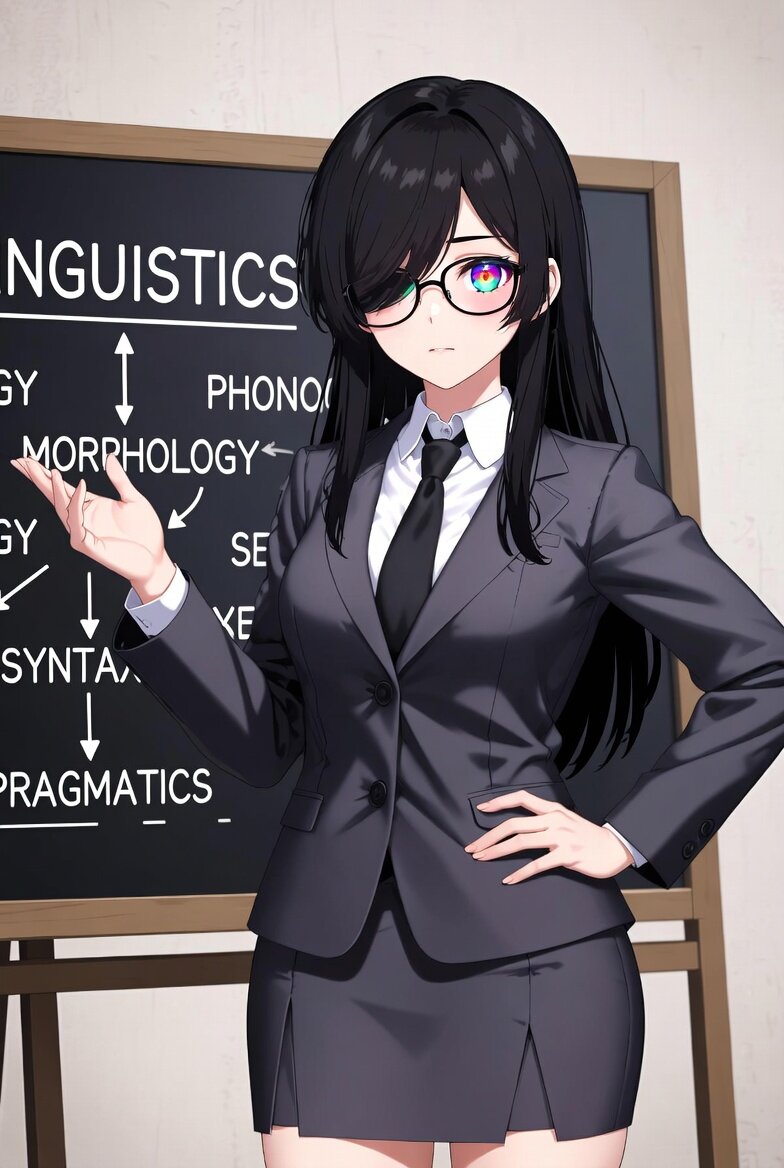 An illustration of a teacher giving a lesson in front of a blackboard.The blackboard has linguistics lesson content written on it. 1 woman, middle breasts, solo, long hair, black hair, hair over one eye, bangs, rainbow eyes,wearing glasses and a women's business suit.