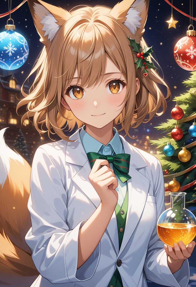 (high resolusion,illustration,ultra detailed 8k art,extremely detailed CG,official art,clothes reflecting light,detailed shiny skin,detailed background:1.3), ((highly detailed beautiful face and eyes),anime_style, fox_ears, girl, light_brown_hair, double_eyelids, long_eyelashes, fluffy_tail, christmas_theme, mad_scientist_outfit, lab_coat, flask, beaker, neon_lights, festive_decorations, sparkling_lights, eccentric_pose, mischievous_expression, expressive_eyes, delicate_features, soft_lighting, whimsical_atmosphere