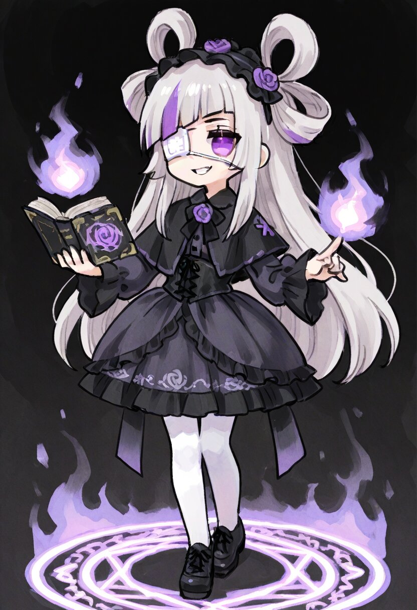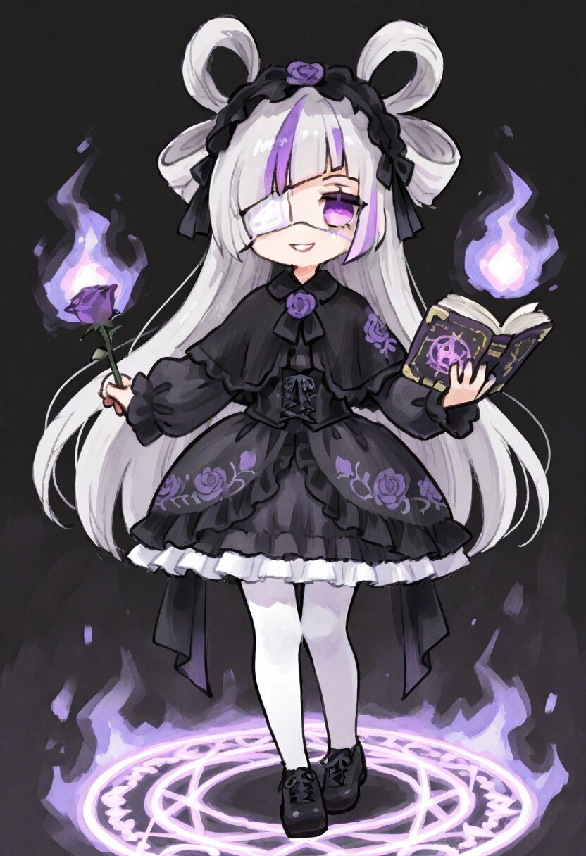 <lora:inmnstyleilxl:0.9>, best quality, masterpiece, very aesthetic, watercolor painting, general, 1girl, chibi, solo, holding grimoire, open grimoire, glowing magic circle, sparkling haze, silver hair, hair rings, diagonal bangs, purple highlights streaked hair, purple eye, medical eyepatch, gothic lolita fashion, frilly haedwear, frilly black dress, longsleeves, black capelet with rose embroidery, lace-up corset, voluminous skirt, white tights, black shoes, grin, black background
