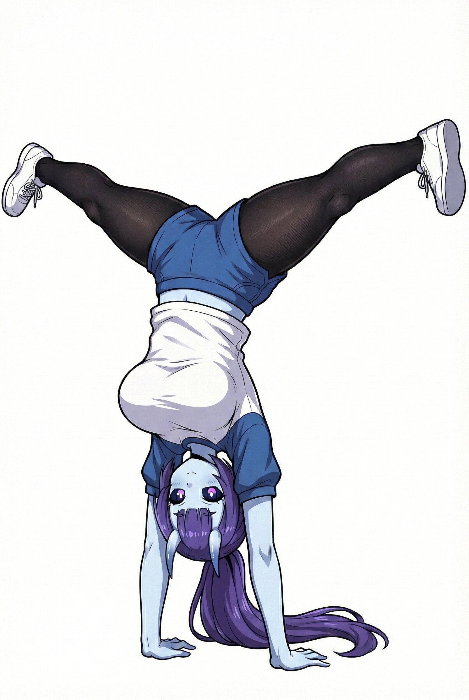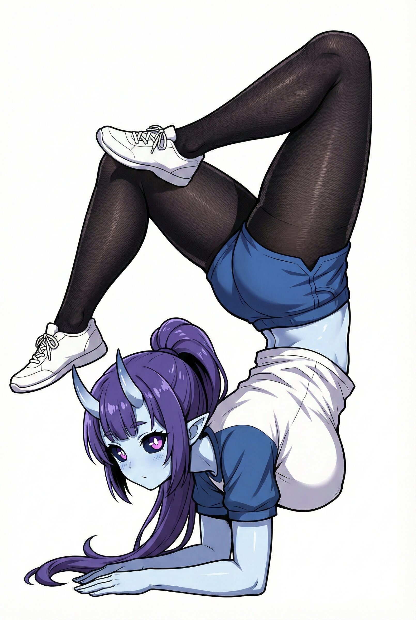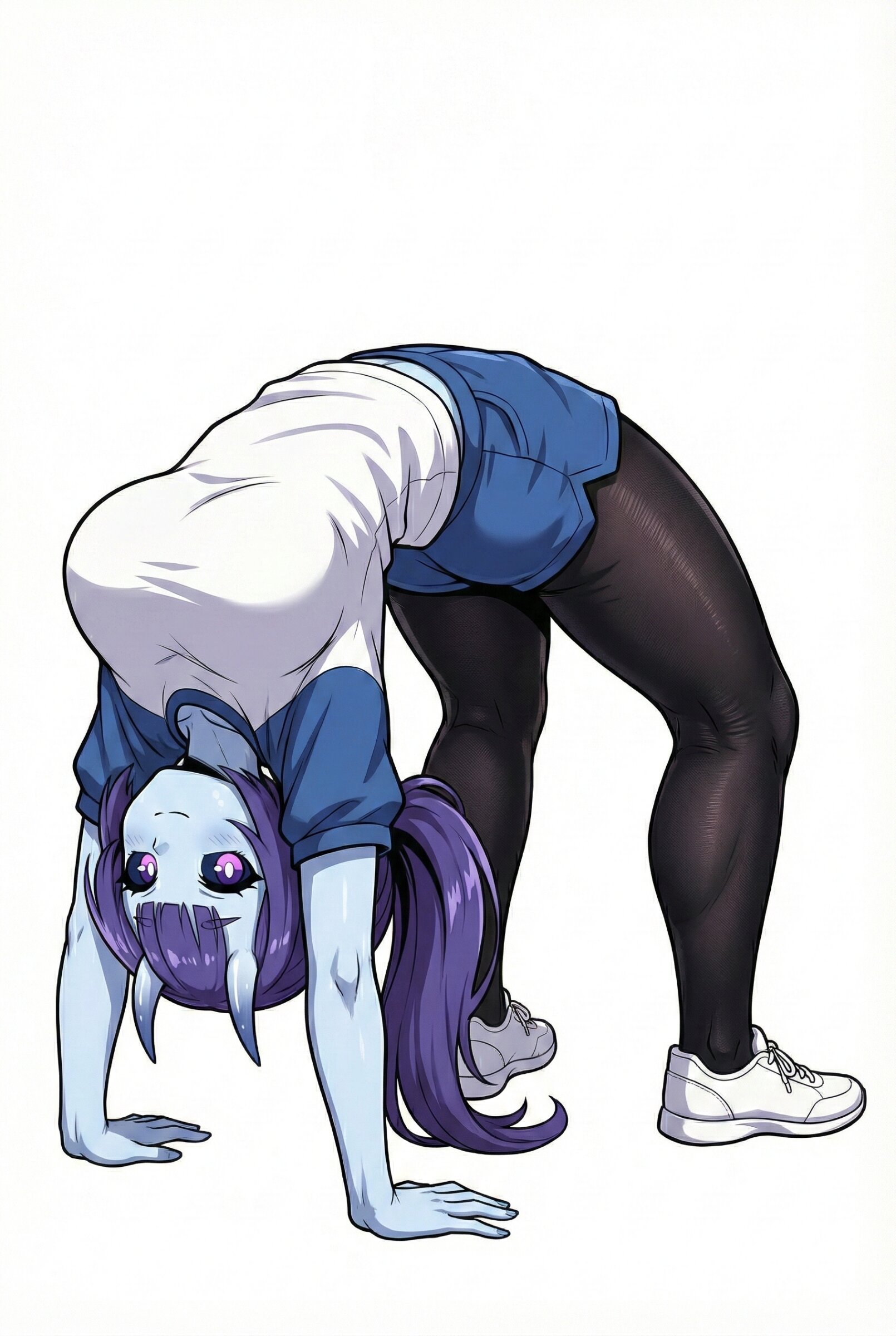 イラストのキャラクターをGペンでペン入れする。2D。カラー。強めの影とコントラスト。線は細く薄くする。フラット。胸と大腿がとても豊満。腰が細い。背が低い。キャラクターの特徴をそのままに、ポーズを完全に変更。キャラクターの強膜は紺色。黒タイツの質感向上。革のローファーを履いている。キャラクターはポニーテール、紫色の瞳、瞳孔が白。背景は白、口を閉ざして微笑んで両手を両側に置いて起立した立ち絵を生成。 ▶︎ 衣服を、青色の半袖をした胴部分が白い体操着に変更。ズボンは青い短パン。質感の高い黒タイツを穿いている。白いスニーカーに履き替える。 ▶︎【ここにポーズ名を入力】のポーズ。キャラクターの強膜は紺色。胸と太腿がとても豊満。黒タイツの質感向上。キャラクターはポニーテール、紫色の瞳、瞳孔が白。 ▶︎参照イラスト五枚を一枚に纏める。各ポーズを線で区切る。キャラクターはポニーテール、強膜が紺色、瞳が紫色、瞳孔が白い。一枚目の体育座りは中央、二枚目のサソリのポーズは右下、三枚目のブリッジのポーズは左下、四枚目の倒立開脚は右上、五枚目の戦士のポーズIIは左上。