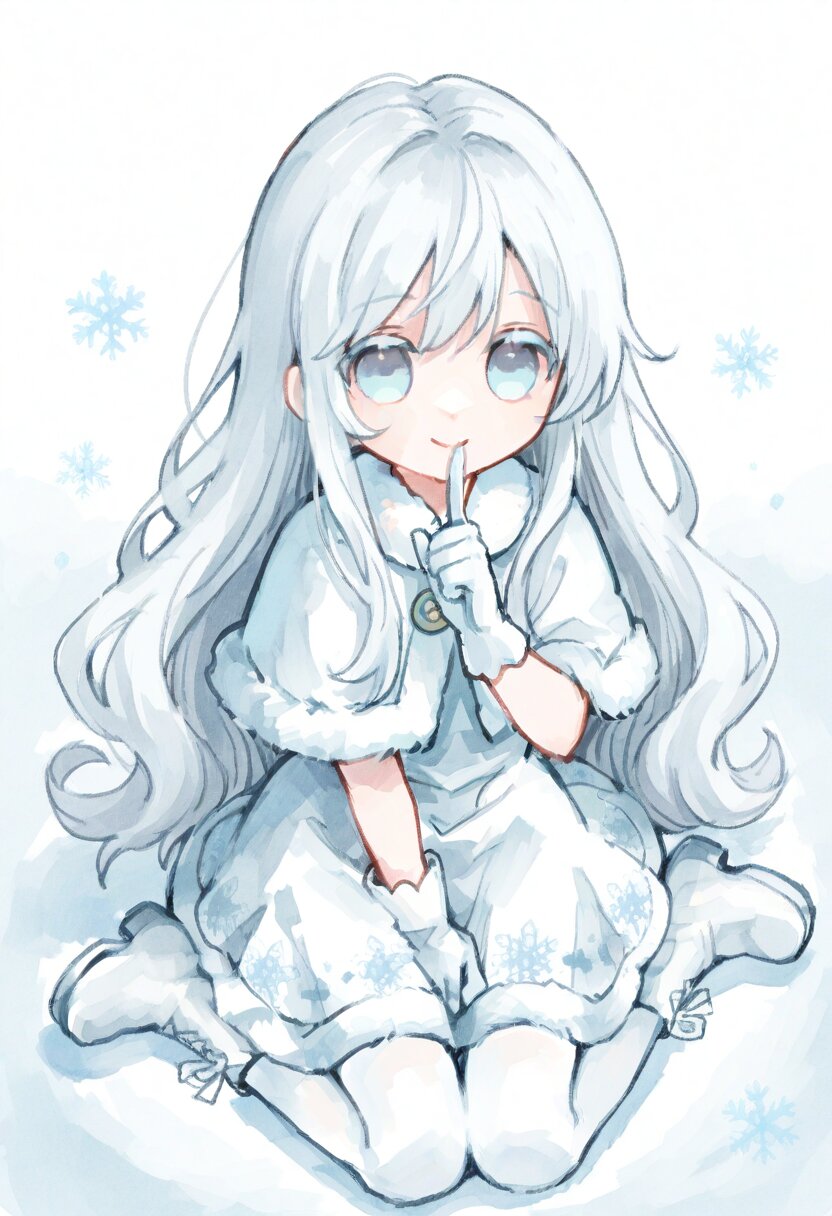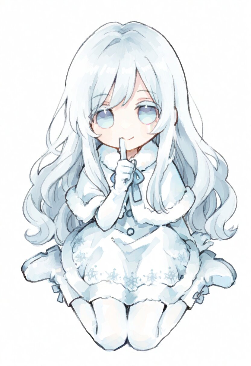 <lora:inmnstyleilxl:0.9>, best quality, masterpiece, very aesthetic, watercolor painting, general, 1girl, chibi, solo, from above, white hair, long hair, curly hair, pale blue eyes, white capelet, fur trimmed capelet, pale blue embroidery, snowflakes embroidery, white dress, long sleeveles, white tights, white boots, white background, snowflakes, smile, shushing, wariza