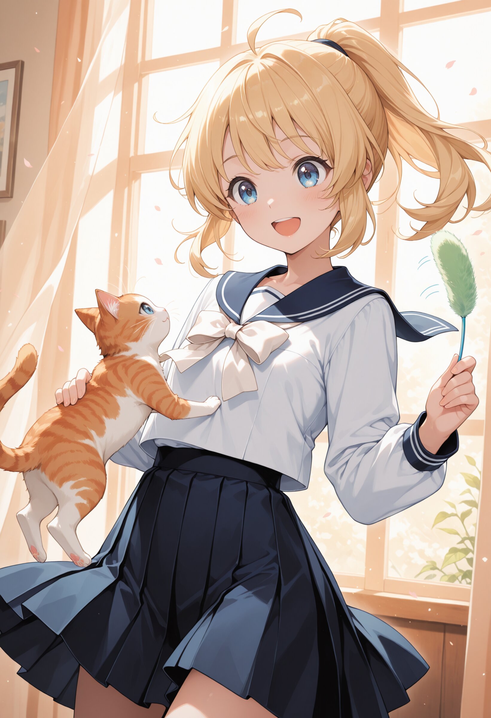 1girl, (young girl), small body, beautiful face and eyes, Beautiful, clear, curious blue eyes, Beautiful hair, floating hair, shoulder length hair, (blonde hair), bobbed hair with ponytail, antenna hair, ahoge, pretty, (flat chest), (small breasts), active personality, Dark blue sailor-style blouse with white trim, long sleeves, Matching Dark blue pleated skirt, knee-length, White sailor collar with white bowtie, playing with a cat, holding a cat teaser toy, :d, big smile, running lightly, joyful movement, energetic pose, cat jumping in mid-air, playful expression, dynamic action moment, lively interaction, hair and clothes gently fluttering, bright cheerful atmosphere, soft sunlight, clean indoor space, warm pastel color palette, light and airy feeling, anime illustration, high quality, detailed, smooth shading , (masterpiece, best quality, ultra-detailed, soft lighting, warm light, gentle shading, delicate texture, pastel tones, soft focus, cinematic soft glow, depth of field)