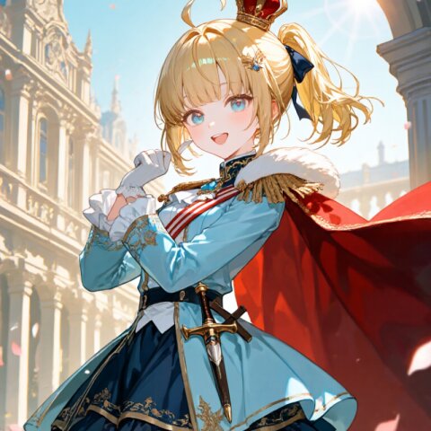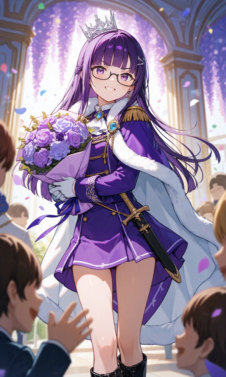 1girl, solo, a 17-year-old girl with a (childish look:1.5) stands proudly in a luxurious palace ballroom, surrounded by an air of romance and celebration. She has long, straight purple hair with blunt bangs, framing her detailed, cute face with purple eyes, glasses, and v-shaped brows. Her slender body is adorned in a (Purple luxurious Prince costume:1.5) with long sleeves, paired with a (White luxurious Cape:1.3) flowing elegantly behind her. A (luxurious mini skirt:1.3) completes the outfit, along with (Black luxurious boots:1.3), (White gloves:1.2), and a (dagger on waist:1.3). A delicate (crown:1.3) rests atop her head as she (holding a bouquet in hand:1.5), smiling happily amidst (surrounded by friends:1.8). The scene is filled with a dreamy, romantic academia atmosphere, with Rococo architecture, lens flare, and soft bloom lighting enhancing the fantasy. The grand ballroom is decorated with cascading flowers, celebrating a birthday in a light, joyful setting. Masterpiece-quality details highlight her flawless skin, intricate hair, and richly designed clothing, creating an insanely detailed 16k visual feast.