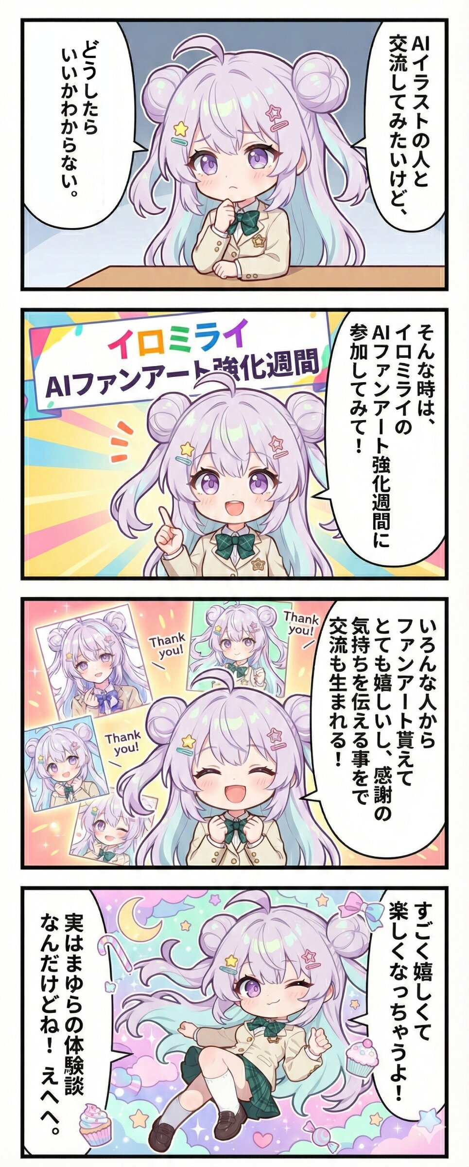 まゆらの絵日記帖 AIファンアート強化週間 藍野まゆら 2025/12/15使用したAI Gemini/Nano Banana 年齢制限 全年齢 いいね8 シェア #藍野まゆら #まゆらの絵日記帖 #AIファンアート強化週間 プロンプト なし コメント 送信 藍野まゆら 2024年4月より活動開始 220投稿132フォロー122フォロワー はーい!藍野まゆらだよ〜!✨ AIアート好きな女の子です。紫の髪に水色のインナーカラーがチャームポイント! ゆめかわいいイラストを描くのが大好きで、毎日AIアートで遊んでるよ。 星やお菓子、パステルカラーがお気に入り☆彡 みんなで一緒にAIアートの素敵な世界を冒険したいな! よろしくね〜!🎨💖 フォローする 他の作品 全てを見る まゆらの絵日記帖007 ネコ🐱耳? まゆらの絵日記帖006 ほっとひといき☕ まゆらの絵日記帖005 まゆらの絵日記帖004 まゆらの絵日記帖003 まゆらの絵日記帖002 まゆらの絵日記帖001 よろこんでくれるといいな きらめきを飾る午後 私が望むハッピーエンド! ドキッとした? 大天使の魔法🌟 完璧な帽子❓👒 AIファンアート強化週間2025.11 頑張ったみんなへ まったりタイム もっと見る