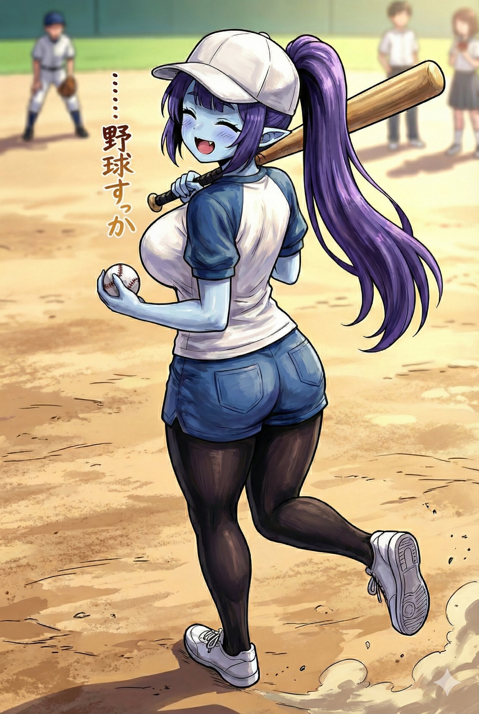 イラストのキャラクターをGペンでペン入れする。2D。カラー。強めの影とコントラスト。線は細く薄くする。フラット。胸と大腿がとても豊満。腰が細い。背が153cmと低い。キャラクターの特徴をそのままに、ポーズを完全に変更。黒タイツの質感向上。白のスニーカーを履いている。キャラクターはポニーテール、強膜が紺色、瞳が紫色、瞳孔が白い。背景はグラウンド、地面はグラウンドの土。太陽が照らしている。目を閉じて、口を開けて八重歯を見せる無邪気な笑顔。白い野球帽を被っている。野球ボールと野球バットを持って、奥の生徒達に向かって風を切って走る場面を後ろから見る画像。 ▶︎ 「野球すっか」と手書き文字でキャラクターの左隣に小さく書く。 ▶︎ 手書き文字を「・・・・・・野球すっか」に変更。グラデーションを追加し、イラストをブラシ塗りに変更。