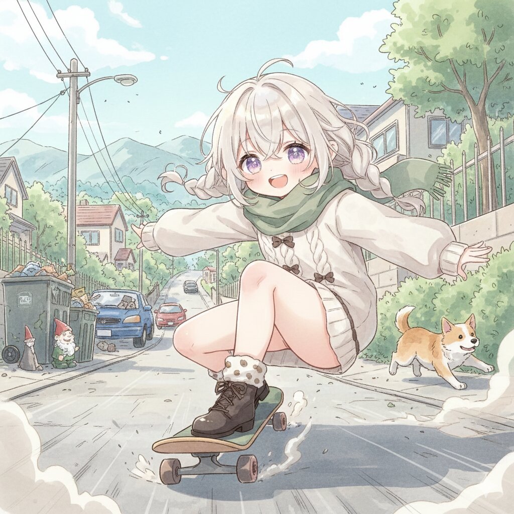 昼間、障害物の多い住宅街の下り坂をスケボーで駆け抜ける可愛らしくもあり、ハイスピードを実感できる疾走感のあるイラストをお願いします。 高精細。アニメ調。 (masterpiece,best quality:1.4)、高解像度。 柔らかい水彩。