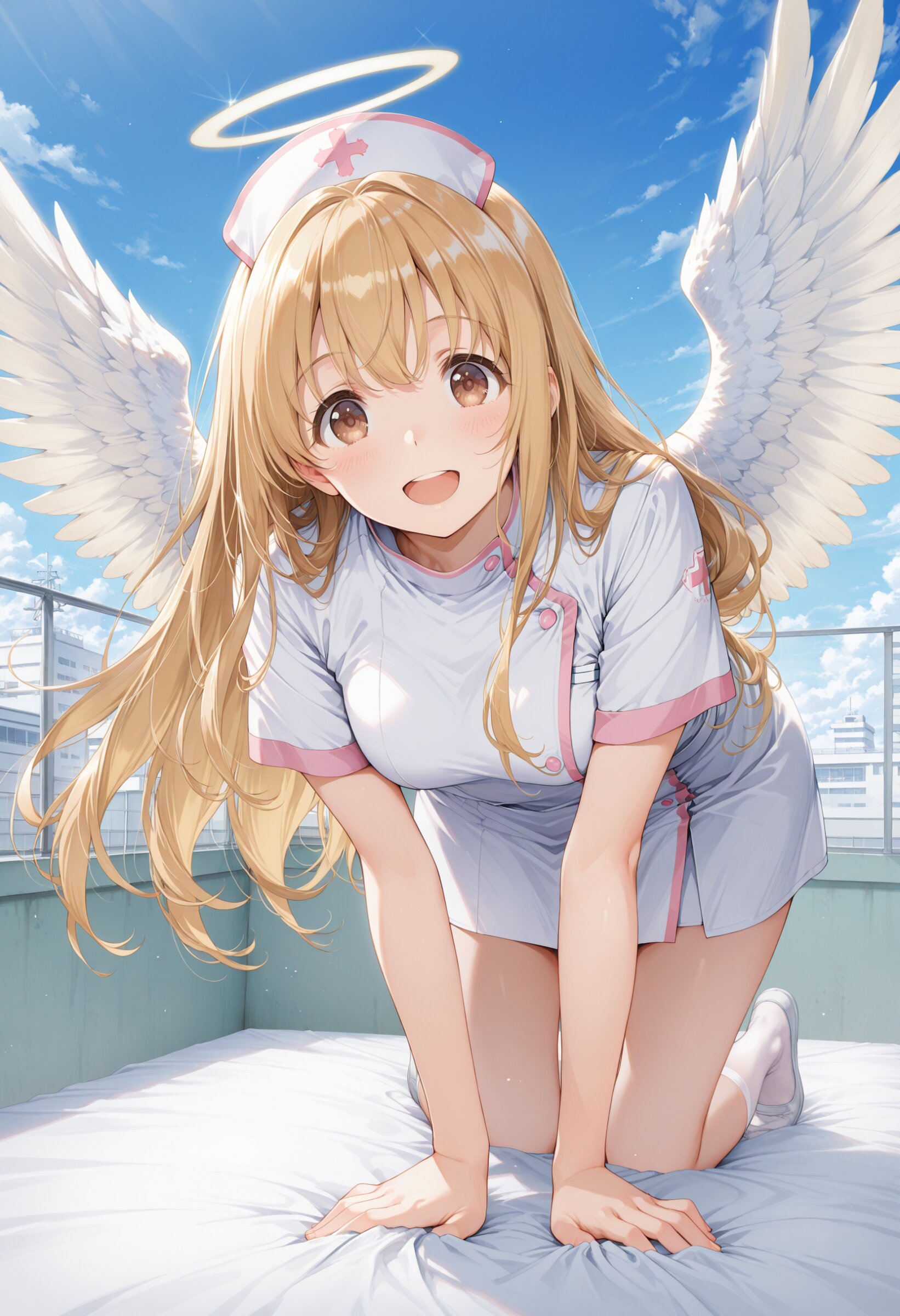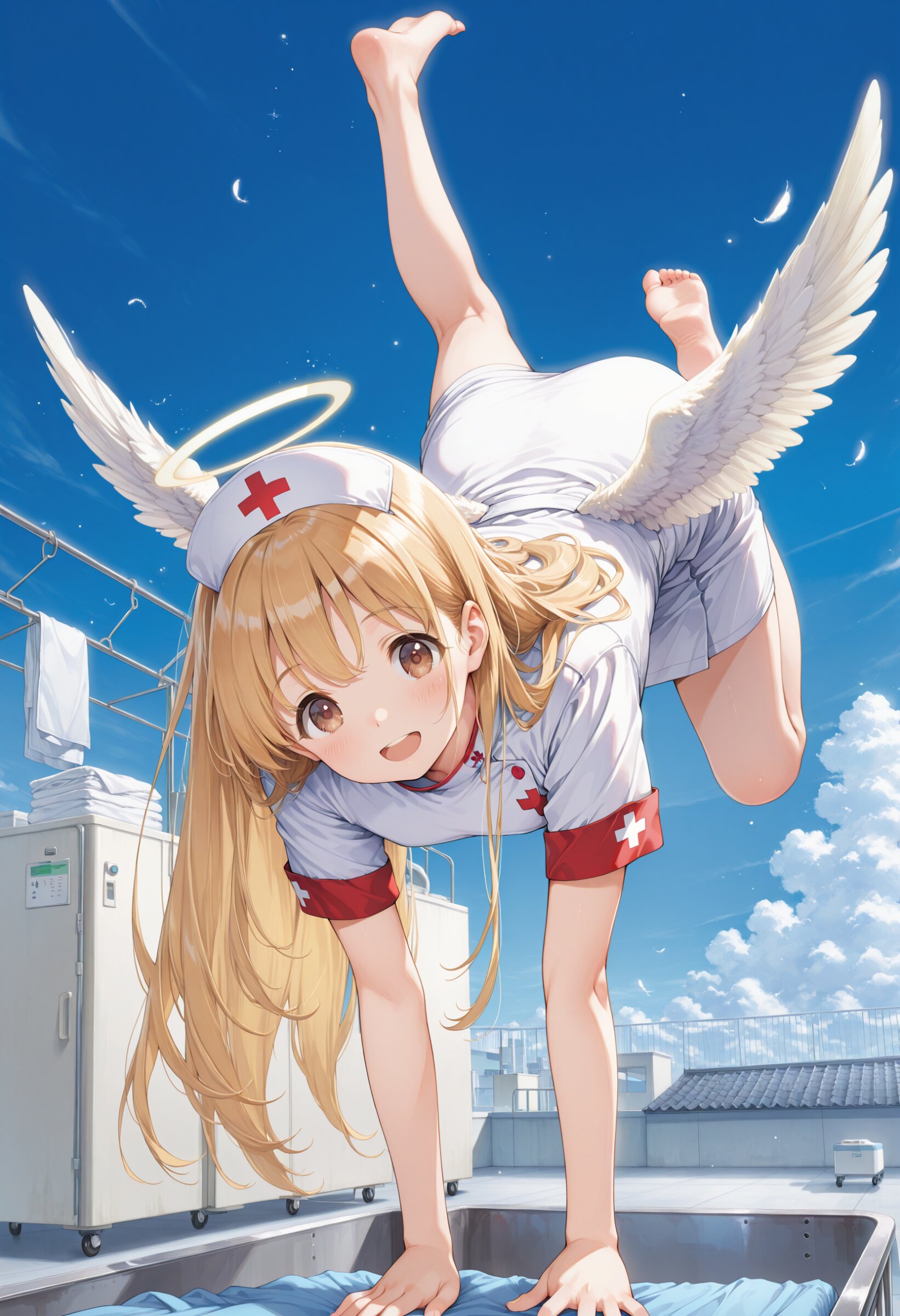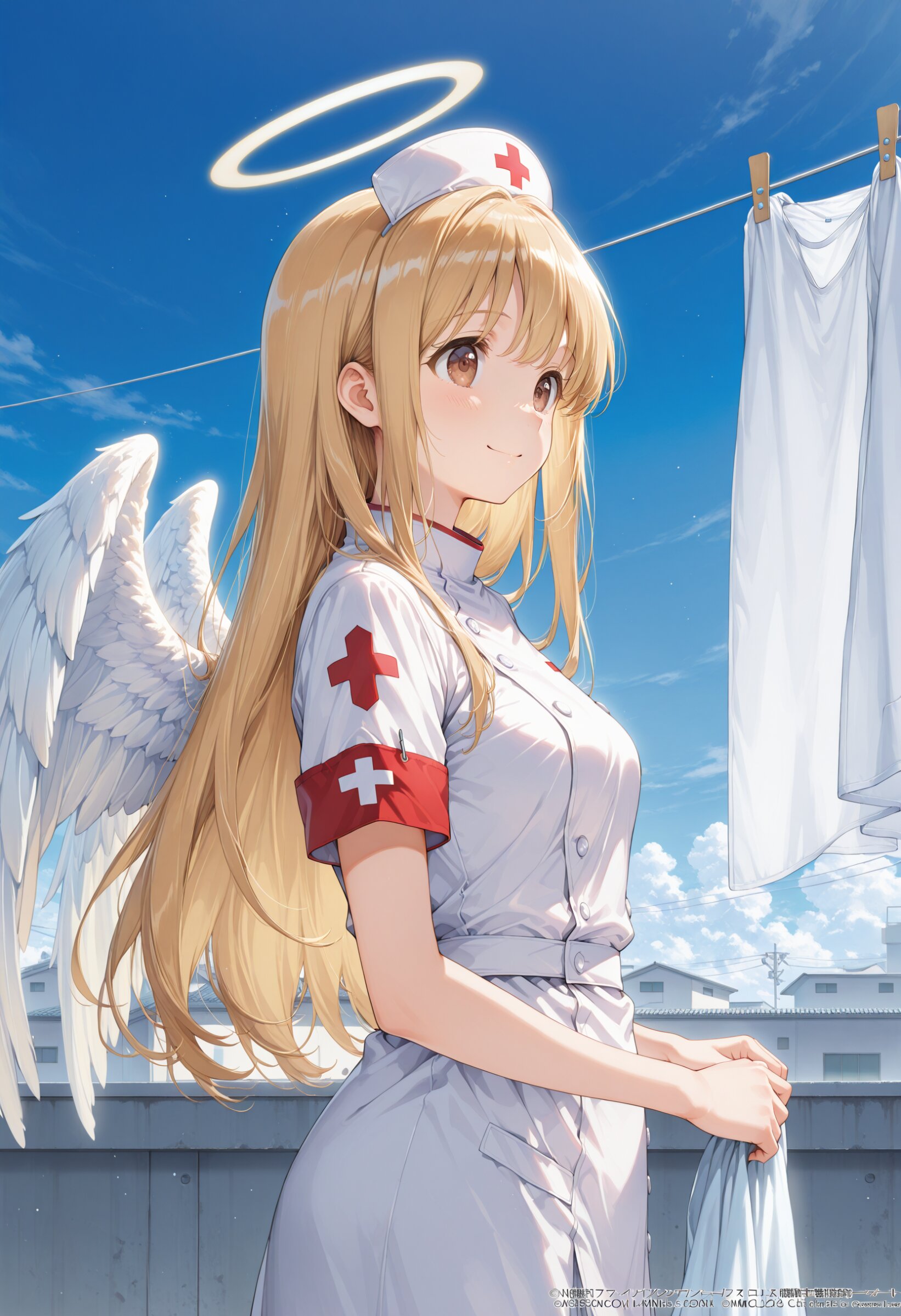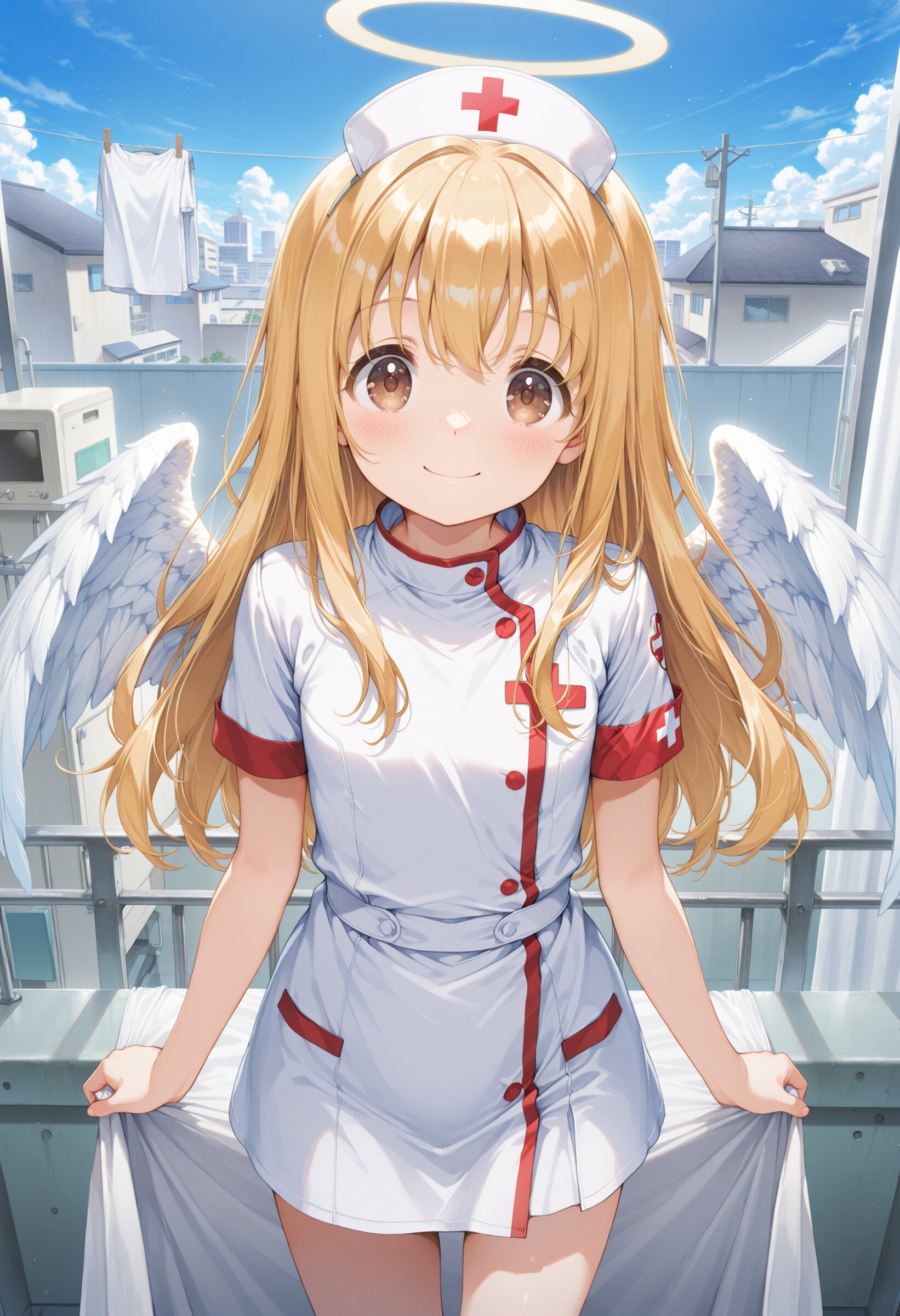 masterpiece, best quality, amazing quality, general, fine detail, official art, 1girl, loli, blonde hair, long hair, brown eyes, (white angel wings:1.2), tiara, tareme, White nurse uniform, hospital, rooftop, Hanging out the laundry, happy, dynamic pose,