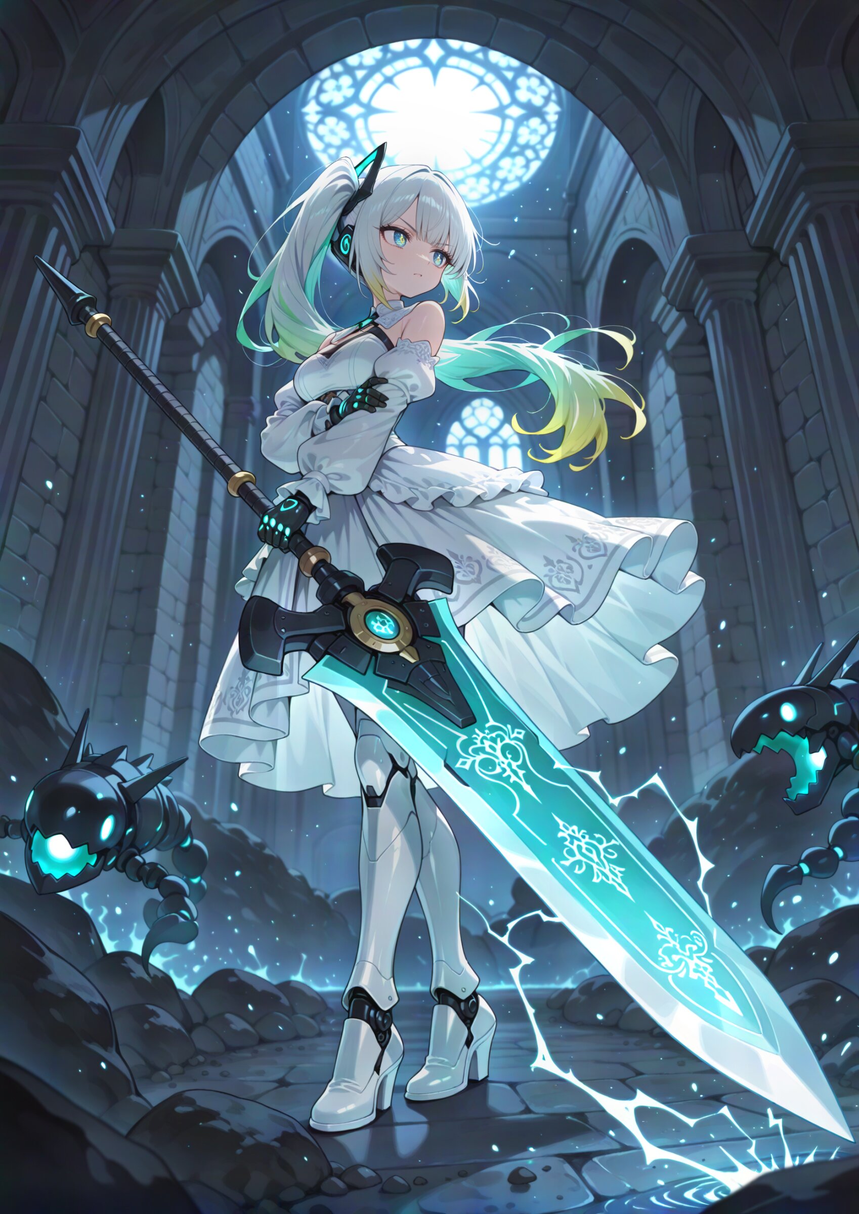 1girl, huge cool polearm in hands, holding huge cool weapon mechanism, machine, foreshortening, dynamic angle (25 years old:1.0), (medium breasts:1.2), (two-tone hair, grey and ever green hair, shoulder length hair, high side ponytail medium bangs:1.0), (beautiful face:1.1), (clear white small eyes:1.0), green pupils , fighting stance, crossed arms, (mechanical black hands:1.0), black robot ears, , (mechanical white legs:1.1), white mechanical thighs, neon trim, medieval times fantasy world, (cybernetic gynoid:1.0), (mech suit:1.0), (white gothic cuirass:1.0), (robot joints:1.0), (white gorgeous modest wizard's dress skirt:1.1), , glossy silver body with metallic luster cyborg, bare shoulders, (Decorative embroidery:1.0), (white gorgeous dress:1.1), (overskirt:1.0), (white sleeve:1.2), electrokinesis, (battle:1.2), (looking away:1.0), from side, turning head (huge pastel colors yellow silhouette of scorpion,serious monster silhouette:1.2), Surrounded by rock walls, a Western fantasy world's cave dungeon features maze-like passages. The entrance is adorned with a moss-covered stone arch, inscribed with ancient runes. Stepping inside, one is greeted by damp air and the earthy smell, with occasional water droplets falling from the ceiling. Along the pathways, embedded crystals emit a dim light, casting eerie shadows on the walls. Deep within, it is said a dragon sleeps, guarding treasure, drawing adventurers to the challenge. However, they face many traps and puzzles, making the journey to the treasure not easily navigable. blurry background, super fine concept art, hard surface, 8K, masterpiece, best quality, amazing quality, very aesthetic, absurdres,