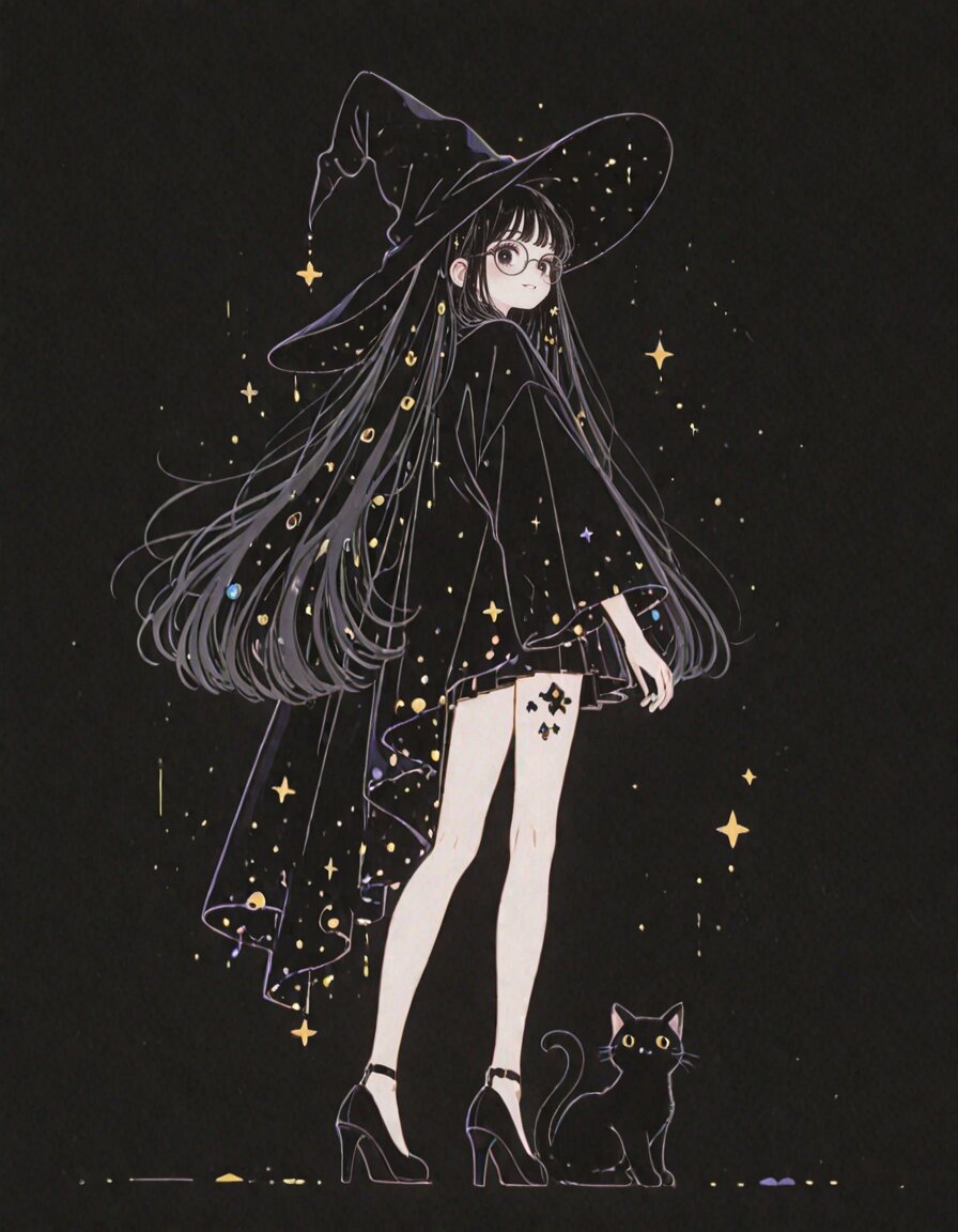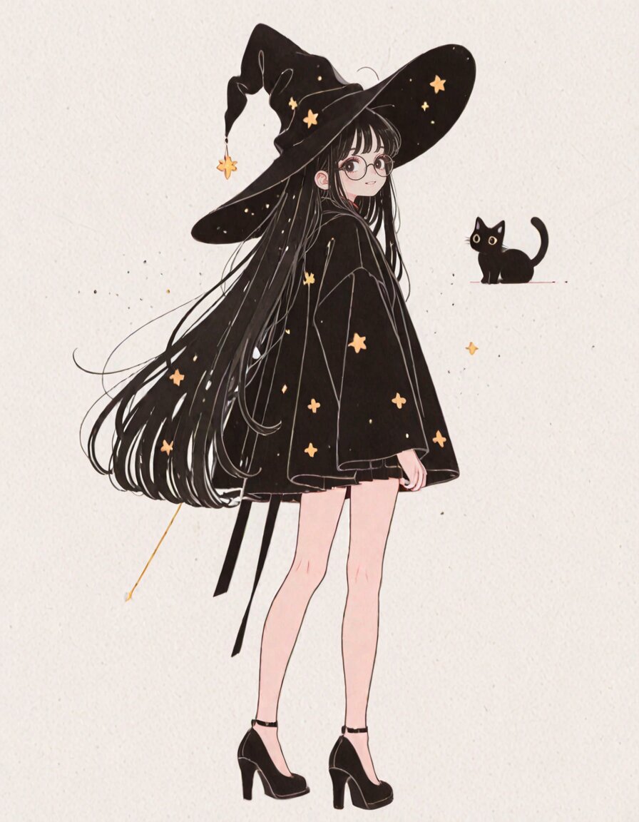 in flat color style illustration. 1girl with glasses:1.3, tareme, wearing a witch hat and jacket, mage robe, black tight miniskirt, (straight black hair, very long hair:1.3), floating hair, high-heels, slender legs, looking back, and a black kitty, (fashion illustration, flat colors, ultra-intricate detailed), flat design, bold colors, patterned fabric, beautiful composition, in the style of cute anime girl. BREAK insanely beautiful and detailed clothes, intricately hair, beautiful small face, long eyelashes, double eyelids, parted lips, smile, kawaii, cute, (flat chest, slender), exquisitely delicate skin, perfect anatomy, perfect legs, dynamic angle, dynamic pose, BREAK (masterpiece, aesthetic quality, 8K, ultra-detailed), (perfect design, realistic complex), absurdres, highres, hyperrealistic, photorealistic, soft lighting, score_9, score_8_up, score_7_up, score_6_up, source_anime, <lora:LCMTurboMix2fix:1>, solo, cute, pencil lines, sketch, kawaii girl,