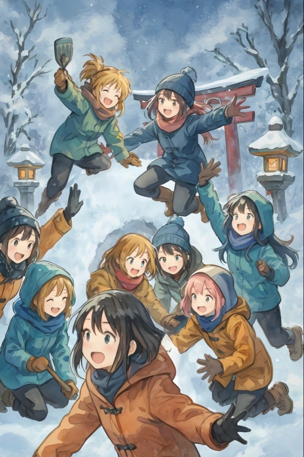 Graphic novel style, watercolor painting style, bold composition, big movements, bold pose, Graphic novel style, watercolor painting style, bold composition, big movements, bold pose, An anime-style illustration depicting eight girls wearing winter gear and thick coats digging into a pile of snow and happily building a large snow hut in the grounds of a shrine enveloped in a fantastical snowscape. In the background, you can see snow-capped trees, a snow-covered torii gate, and a stone lantern. As the snow falls, the moonlight gently illuminates the area, creating a fantastical atmosphere.