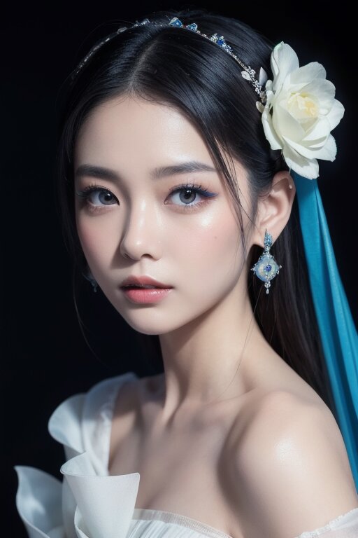 Line art,splatter,minimalist elegance,beautiful blue enchantress rose fairy, Tang Dynasty royal face ancient style beauty, high-definition fashion photography,high-end,ambiguous atmosphere, a woman, painted blue flowers on her face, blue flowers, on her face, looking at viewer, in the style of anime art, luminous and dreamlike scenes, made of crystals, light white and silver, cute and dreamy, in the style of china punk,romantic scenery,animated gift, photo-realistic hyperbole,dark white and dark beige,strip painting, Bright background,detailed depiction, Delicate face and costume details, lifelike appearance HD 16K,cinematic lighting, chiaroscuro,Arbitrary view,Medium Shot, hyper realism,Hollywood style,photography,HD Details,Detail Expression,Rich Details,