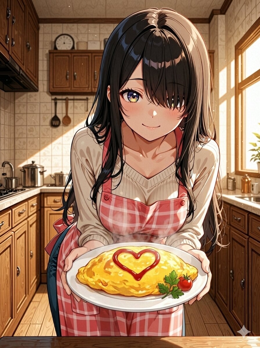 1 woman, middle breasts, solo, long hair, black hair, hair over one eye, bangs, rainbow eyes, wearing a cozy home apron, simple light-colored apron with soft fabric texture, casual indoor outfit underneath, kind smile, caring expression, looking at viewer, slightly leaning forward, domestic and heartwarming atmosphere, home kitchen interior, wooden table, warm lighting, soft sunlight from window, clean and cozy space, soft shading, warm color palette, , (masterpiece, best quality, ultra-detailed, anime style, flat color, depth of field) 上記で生成後に、Geminiで以下。 この人がケチャップでハートを描いた美味しそうなオムライスを両手で優しく差し出してくれているシーン。